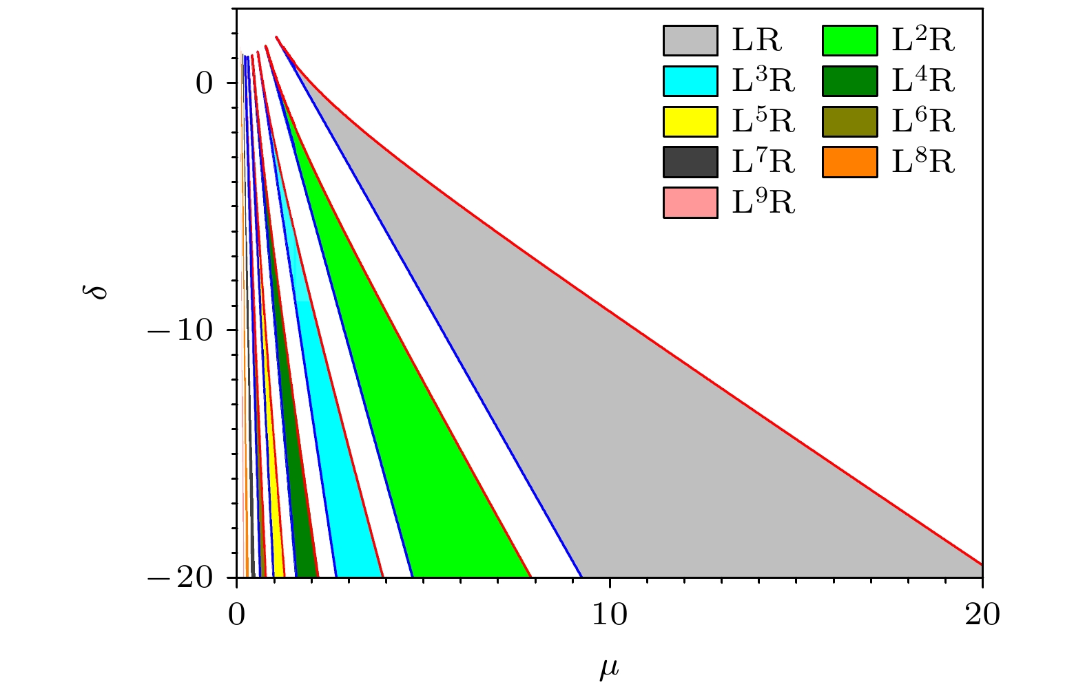 Fig. 6. Critical bifurcation curves in phase space $ \mu-\delta $, where $ z=-0.6, \alpha=0.6 $ and $ \beta=-3 $. The stable $ L^{n-1}R $ periodic orbits are permitted in the colored areas, in which the blue-lines and the red-lines mark the critical curves $ \mu_{n, {\rm{fold}}} $ and $ \mu_{n, {\rm{BC}}^{-}} $ of the fold and border collision bifurcations, respectively. Those orbits are prohibited out of the colored regions.