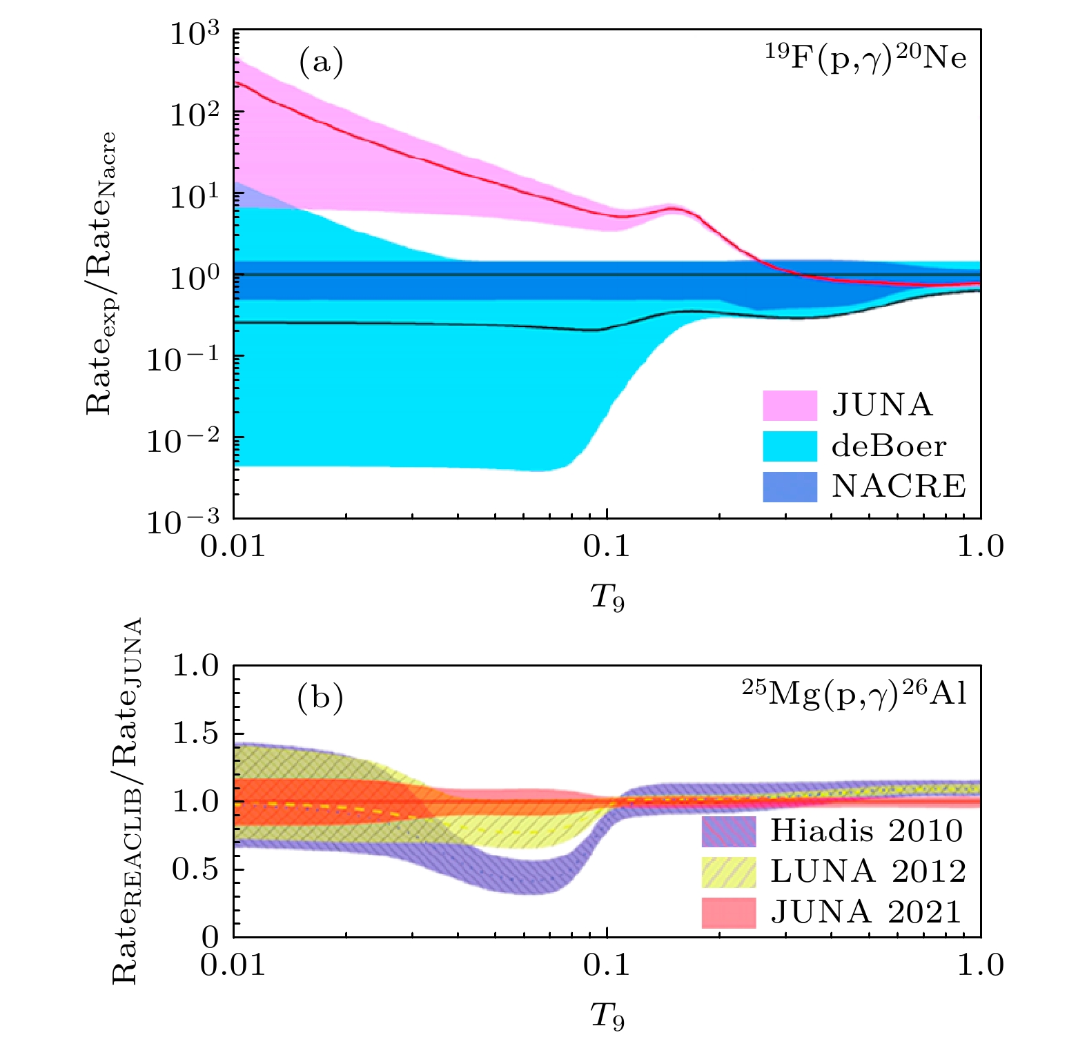核反应 实验技术 核反应率数据库收录 参考文献 25Mg(p, γ)26Al 地下实验直接测量 REACLIB未更新 [79] 13C(α, n)16O 地下实验直接测量 REACLIB未更新 [76,80] 19F(p, γ)20Ne 地下实验直接测量 REACLIB未更新 [81] 19F(p, α)16O 地下实验直接测量 REACLIB未更新 [82] 18O(α, γ)22Ne 地下实验直接测量 REACLIB未更新 [77,83] 2H(p, γ)3He 地下实验直接测量 REACLIB未更新 [71] 12, 13C(p, γ)13, 14N 地下实验直接测量 REACLIB未更新 [73] 59Fe(n, γ)60Fe β-Oslo方法 REACLIB未更新 [52] 22Mg(α, p)25Al MUSIC, AT-TPC REACLIB未更新 [56,85] 14C(n, γ)15C 超导螺线管 REACLIB未更新 [59] 12C+12C THM, TTIK REACLIB未更新 [61,63] 12C(α, γ)16O ANC REACLIB未更新 [86,87] 22Ne(α, n)25Mg, 22Ne(α, γ)26Mg 转移反应, 直接测量 REACLIB未更新 [88] 39K(p, γ)40Ca 转移反应 STARLIB, REACLIB [89] 18Ne(α, p)21Na 镜像核, 转移反应 STARLIB [90] 9Be(n, γ)10Be 活化法+AMS REACLIB [91] 30Si(p, γ)31P 直接测量 REACLIB [92] -