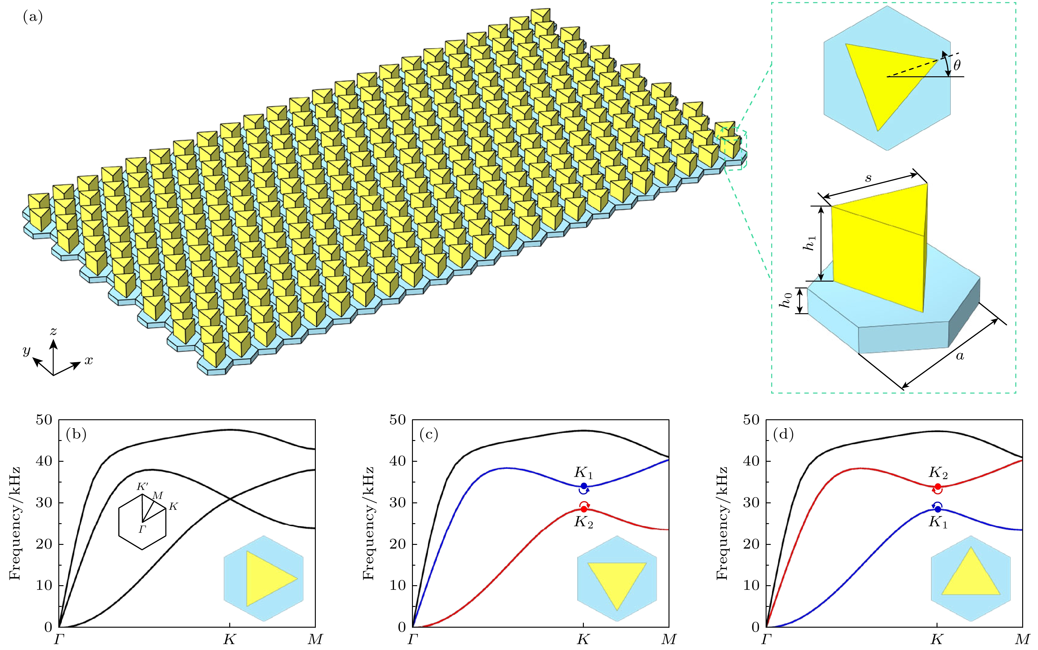 图 1 (a)声子晶体板的整体结构和声子晶体的单胞结构以及各尺寸参数; (b)六边形声子晶体中三角形棱柱体不同旋转角度θ=0°, θ=30°和θ=–30°的能带结构, 不同旋转角度的单胞形状位于每个图的下方, 图(a)中的插图为六边形晶格的布里渊区