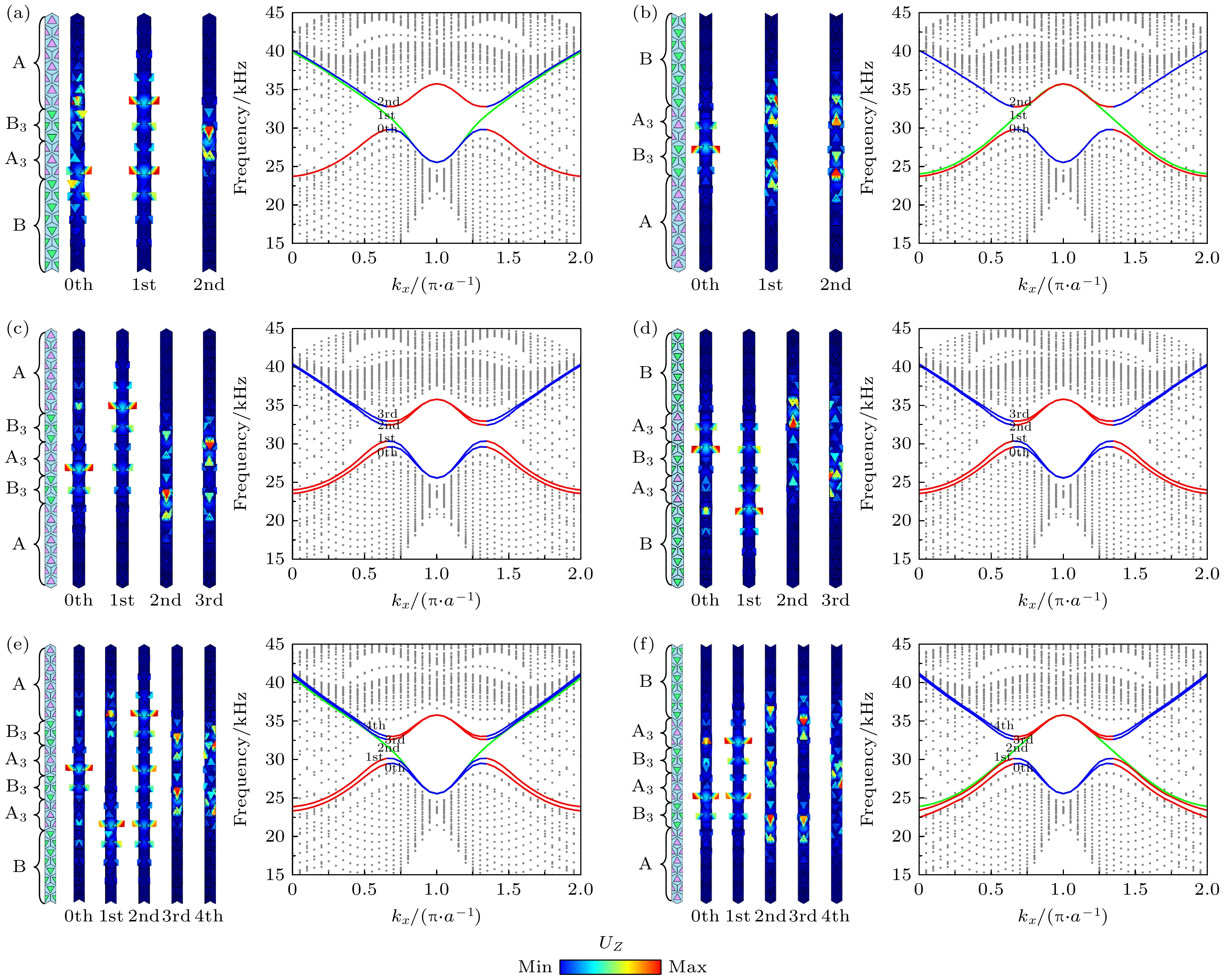 图 4 不同排列组合的多层异质夹层结构超胞能带图和位移场分布 (a), (c), (e)分别表示AB3A3B, AB3A3B3A和AB3A3B3A3B夹层结构的超胞能带和边缘态对应的位移场分布; (b), (d), (f)分别为BA3B3A, BA3B3A3 B和BA3B3A3B3A结构排列的超胞能带和边缘态对应的位移场分布图. 灰点表示体态, 红蓝拼接线表示耦合后的边缘态, 其中绿色线表示未发生耦合的边缘态