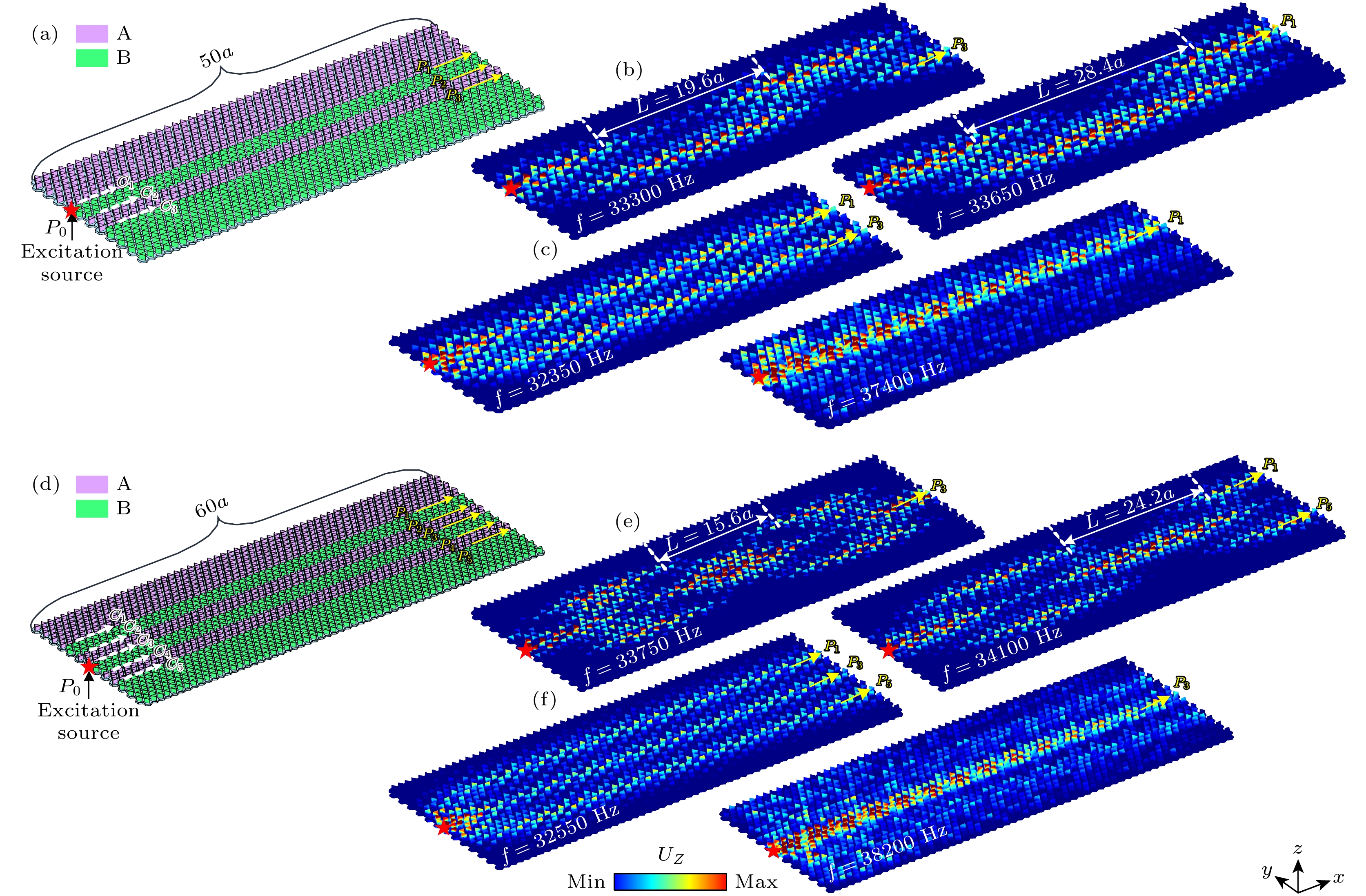 Fig. 5. (a) Wave propagation schematic in the AB3A3B sandwich heterostructure; (b), (c) the displacement field distribution maps of the multimode interference effect and other frequency ranges in the AB3A3B intercalated heterostructure; (d) wave propagation schematic in the AB3A3B3A3B sandwich heterostructure; (e), (f) the displacement field distribution maps of the multimode interference effect and other frequency ranges in the AB3A3B3A3B intercalated heterostructure.