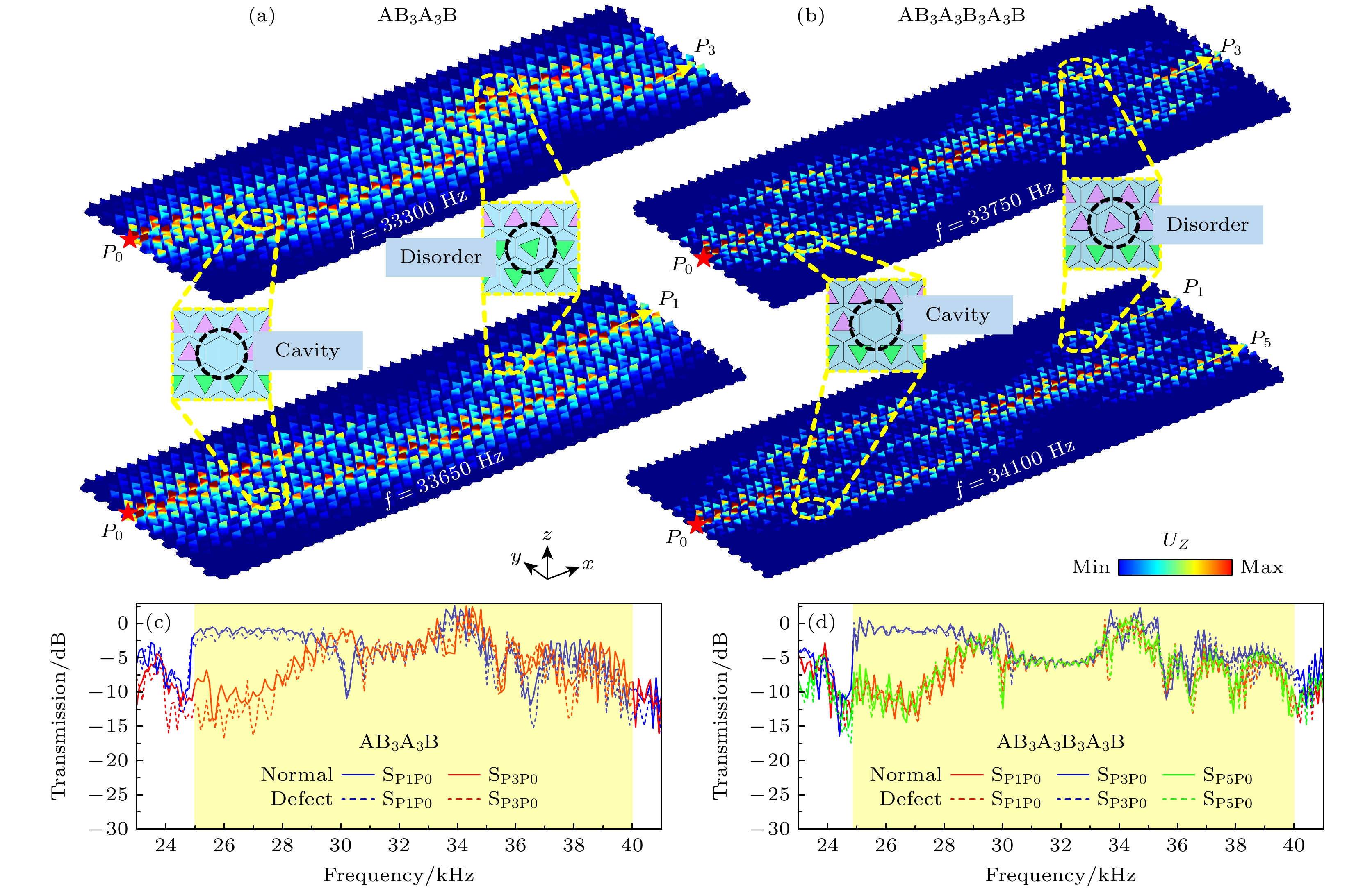 Fig. 6. Robustness verification of sandwich heterostructures against two defect types: (a) Displacement field distribution in AB3A3B heterostructure with cavity defects and disordered perturbations; (b) displacement field distribution in AB3A3BA3B heterostructure with cavity defects and disordered perturbations. Defect locations are marked by yellow dashed lines; (c) a comparison of the transmission efficiency from port P0 to ports P1 and P3 between defective and pristine AB3A3B heterostructures; (d) the corresponding comparison from P0 to ports P1, P3, and P5 for the AB3A3BA3B heterostructure. In both plots, the curves are color-coded by their output ports, and the edge state frequency range is highlighted in yellow.