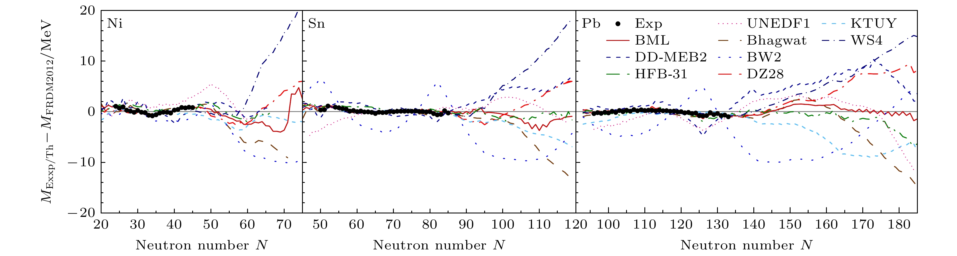 Fig. 1.  The differences between the mass predictions of various nuclear mass models and FRDM2012 model for Ni, Sn, and Pb isotopes, solid black circles denote the differences between experimental masses and the predictions of FRDM2012.