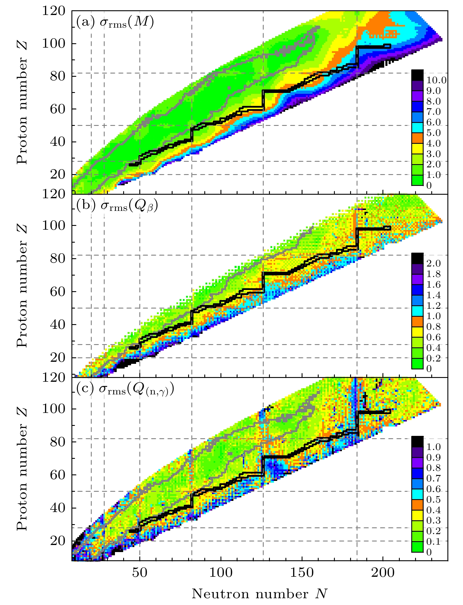 Fig. 2.  Uncertainties of nuclear mass M, β-decay energy $ Q_{\beta} $, and the reaction energy of (n, γ) $ Q_{(\rm n, \gamma)} $. The grey solid lines denote the boundaries of the corresponding experimental data ranges. The figure also shows the r-process path taken from Ref. [75] for guiding eyes, represented by the black solid lines, which is predicted based on the classical r-process model.