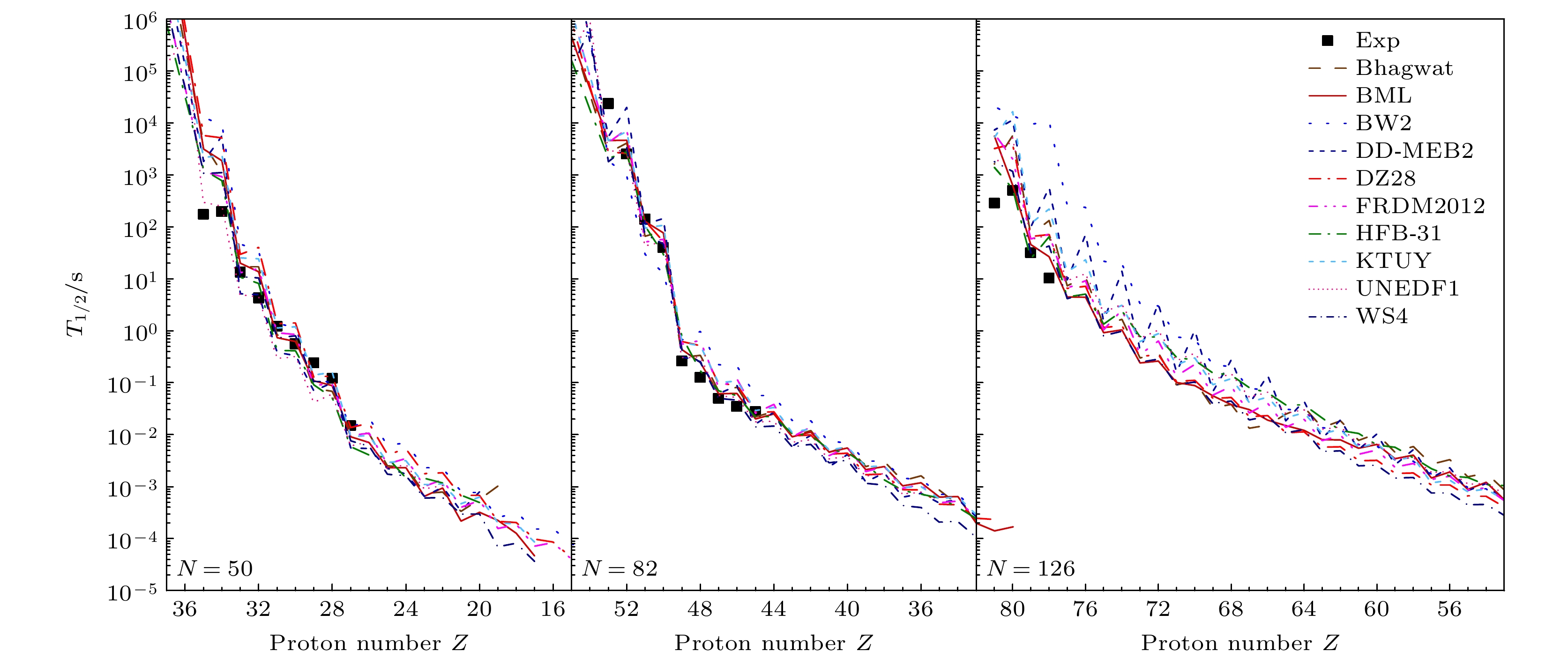 图 3  基于半经验公式(1)和各模型的核质量预测计算的$ N=50, \; 82, \; 126 $同中子素链的β衰变半衰期, 并与实验半衰期[18]比较
