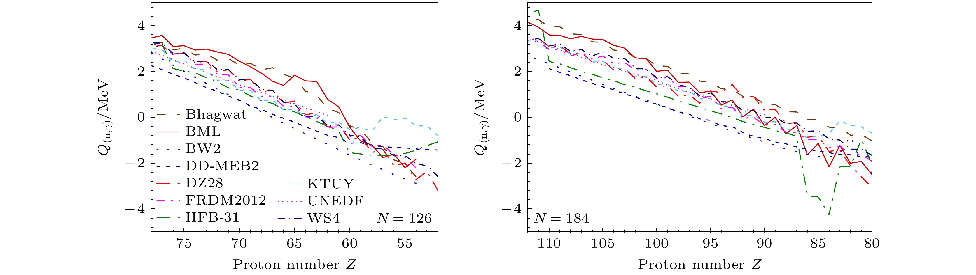 Fig. 6.  $ (\rm n, \gamma) $ reaction energies $ Q_{(\rm n, \gamma)} $ of $ N=126, \; 184 $ isotones predicted by various nuclear mass models.
