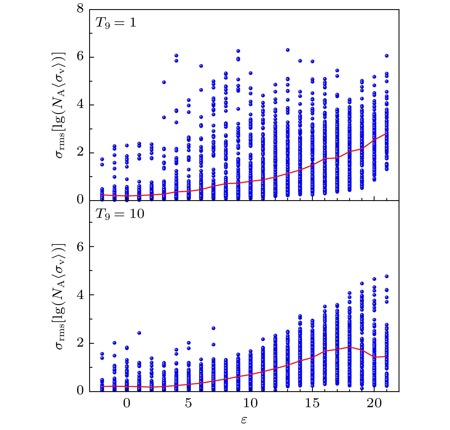 图 8  在温度$ T_9=1, 10 $时, $ \sigma_{\rm rms}(\log_{10}(N_A \langle\sigma v \rangle )) $随与稳定线距离的分布