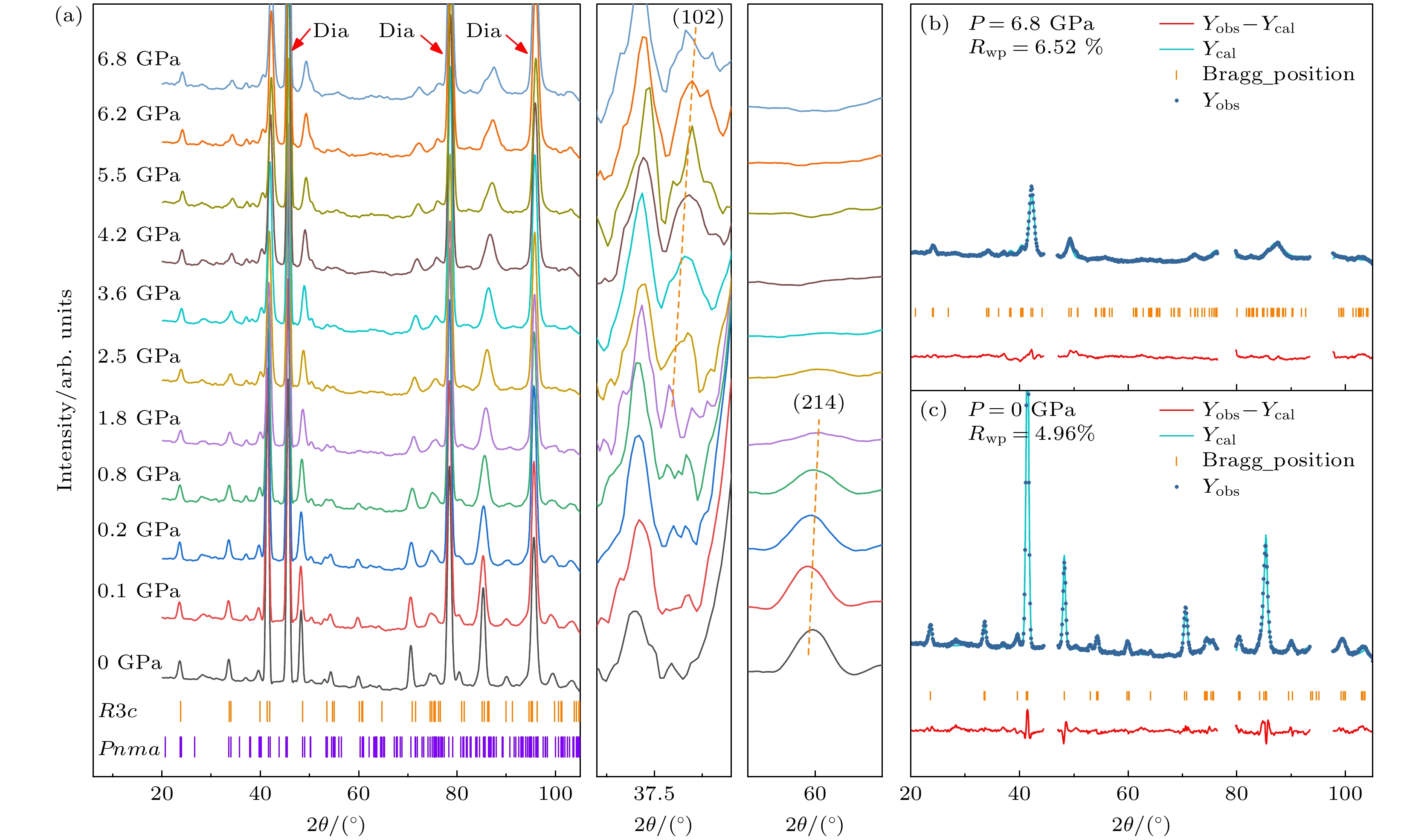 图 1 NBT的原位高压中子衍射谱 (a) NBT衍射图谱在压力下的演化; (b) 高压下对Pnma相的精修图; (c) 常压下对R3c相的精修图