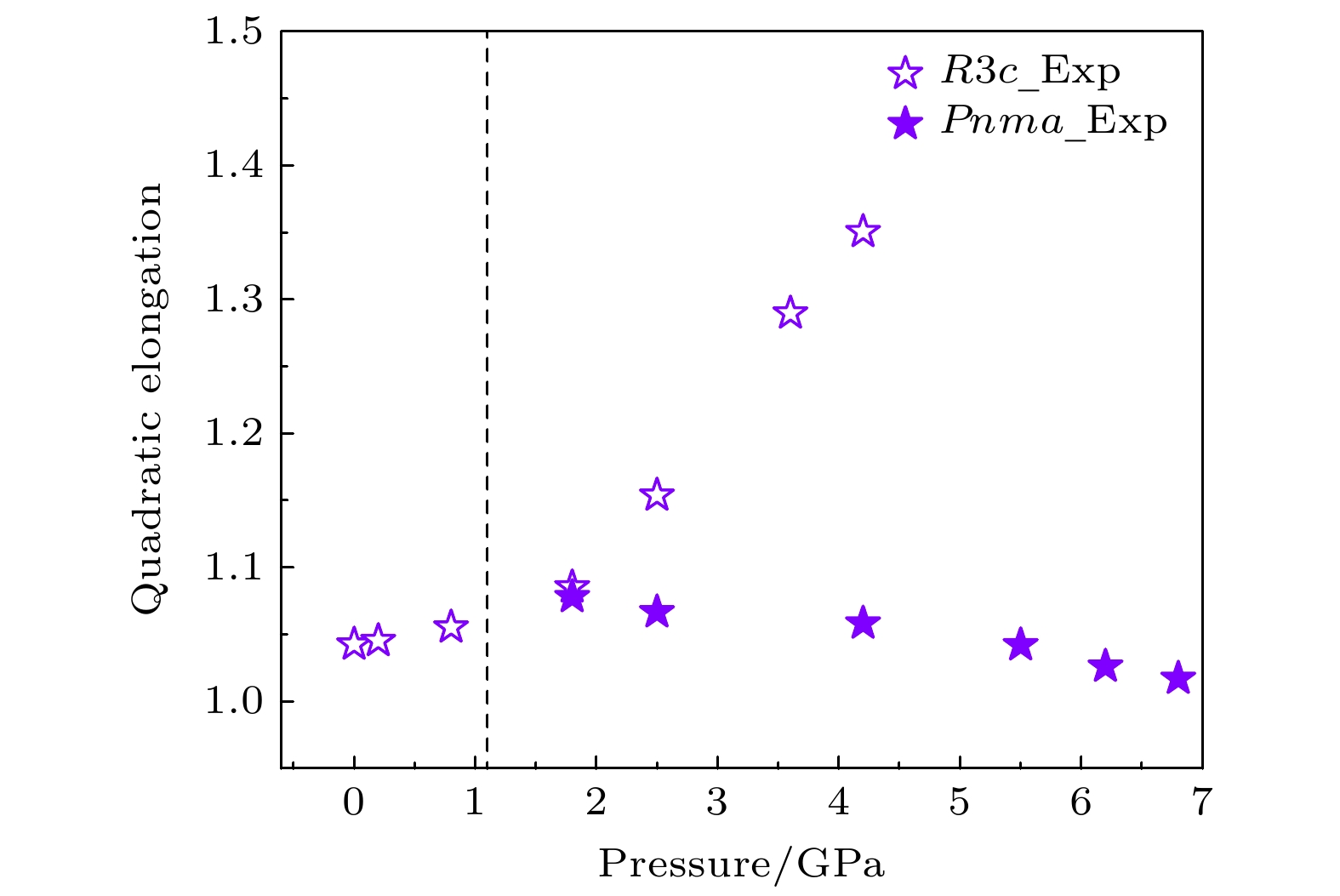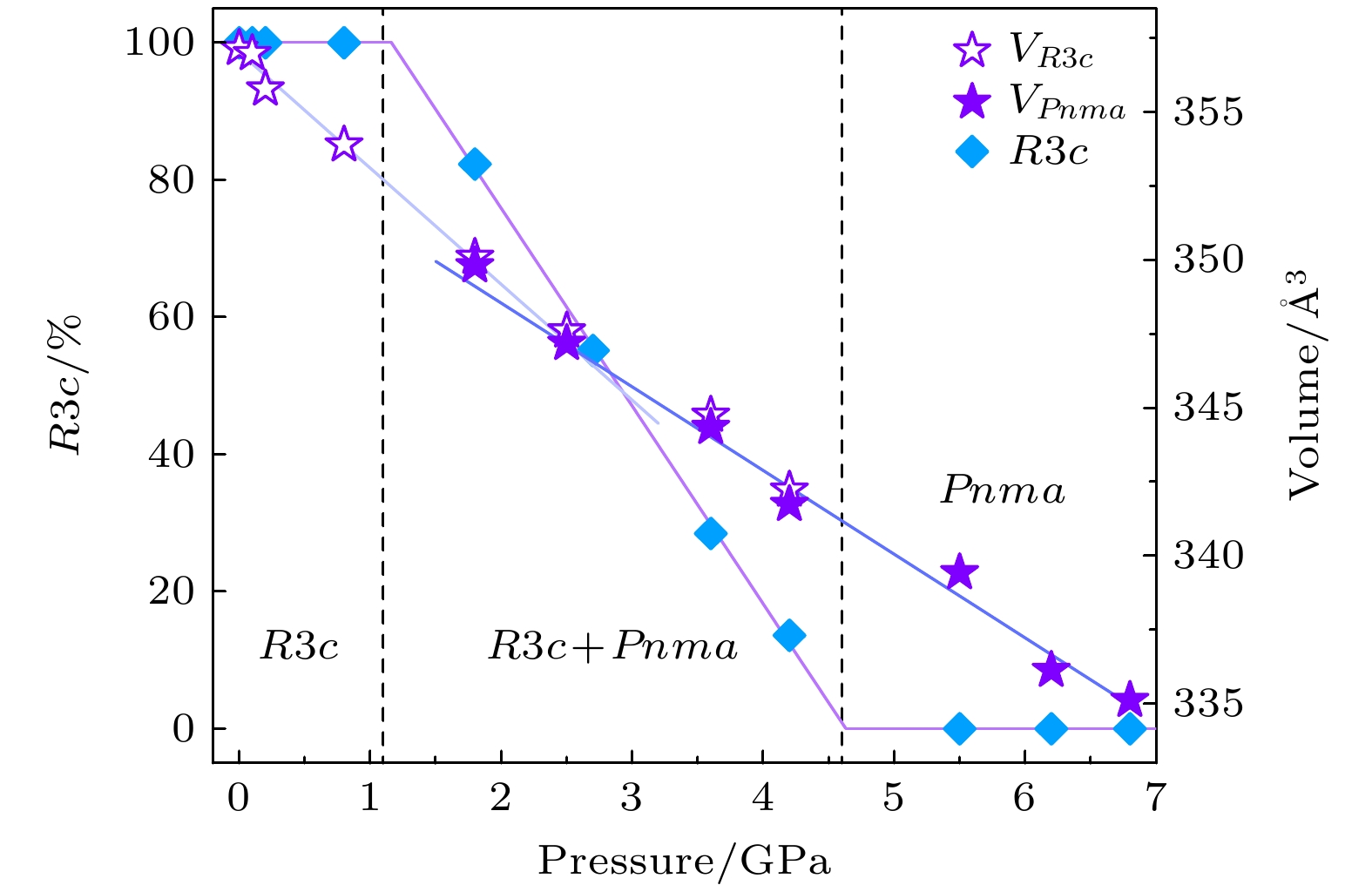 P/GPa Rhombohedral-R3c (Z = 6) Orthorhobmic-Pnma (Z = 4) Rwp/% a/Å c/Å a/Å b/Å c/Å 0 5.51769 13.53806 — — — 4.96 0.1 5.51658 13.52609 — — — 4.30 0.2 5.51054 13.51019 — — — 4.35 0.8 5.49948 13.52777 Phase appears 4.78 1.8 5.48487 13.43632 5.48603 5.48620 7.74757 6.39 2.5 5.47163 13.40546 5.47582 5.46863 7.72857 6.39 3.6 5.45653 13.36911 5.46078 5.45307 7.70844 4.95 4.2 5.44308 13.33665 5.44823 5.43878 7.6879 6.04 5.5 Phase disappears 5.43504 5.42606 7.67246 6.26 6.2 — — 5.41434 5.41443 7.64334 5.75 6.8 — — 5.41406 5.40337 7.63613 6.52 表 2 NBT两相体积模量信息