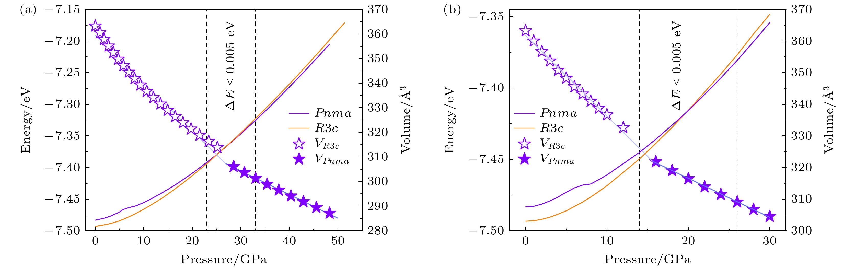 图 3 第一性原理计算获得的NBT两相归一化晶胞体积和平均原子能量随压力变化图 (a) 在设定压缩率各向同性下的计算结果; (b) 在设定压力各向同性下的计算结果