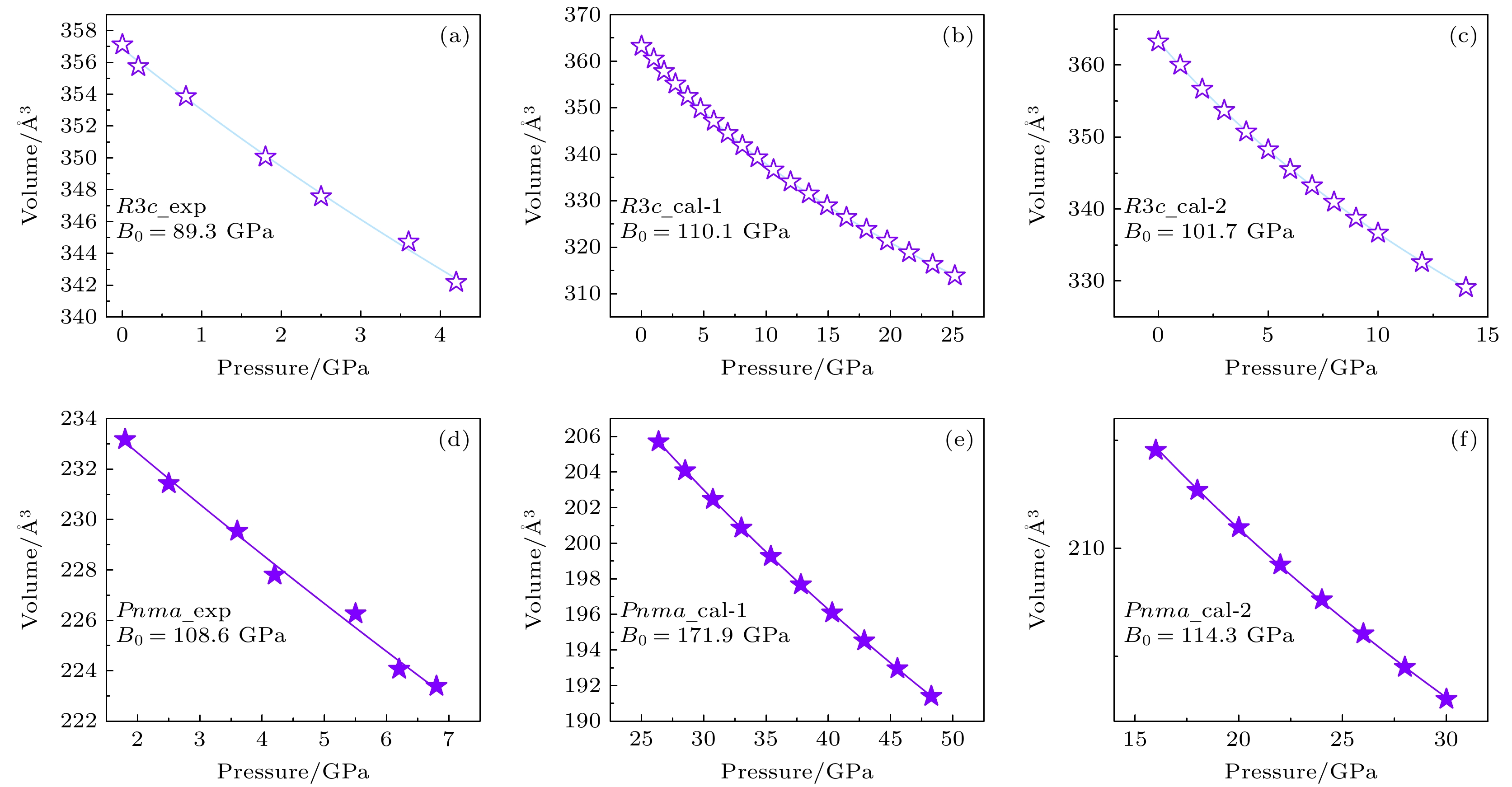 图 4 NBT体积压力曲线拟合结果 (a)—(c) 中子衍射实验、Cal-1和Cal-2计算获得的R3c相体积压力曲线; (d)—(f) 中子衍射实验、Cal-1和Cal-2计算获得的Pnma相体积压力曲线图