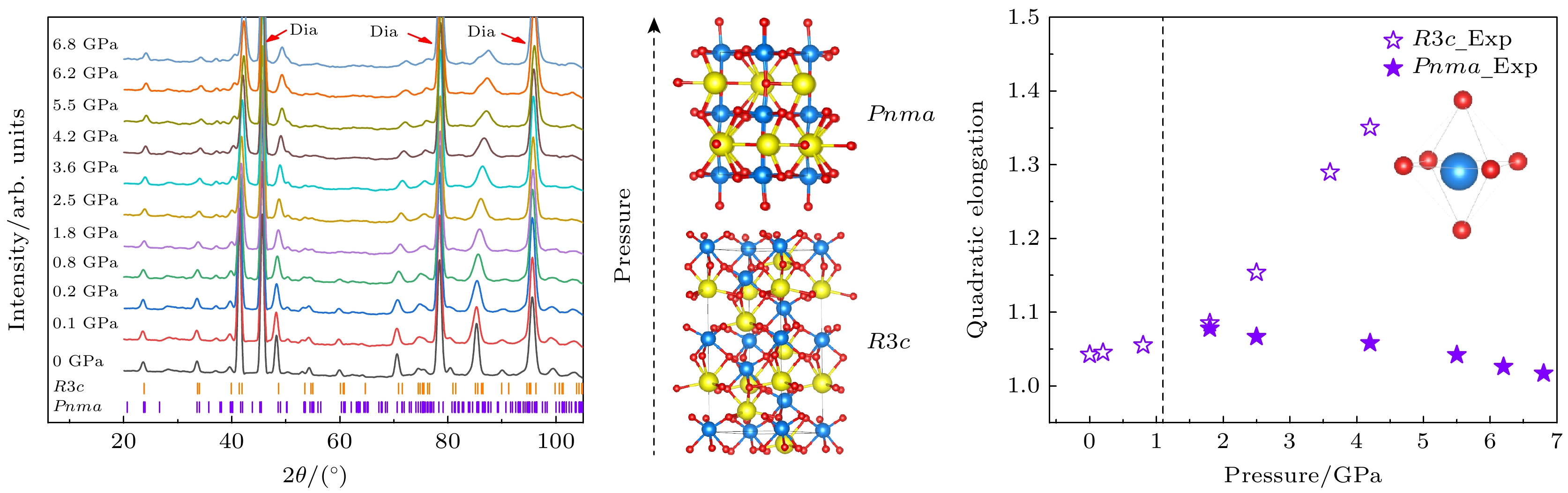 弛豫铁电体钛酸铋钠(Na0.5Bi0.5TiO3, NBT)具有优异的铁电性能, 被广泛认为是极具应用前景的无铅铁电材料. 深入阐明其在高压下的结构演化规律与相变机理, 对于推动这类环境友好型铁电材料的应用至关重要. 本研究结合原位高压中子衍射实验与第一性原理计算, 研究了NBT在高压下的结构演化规律. 高压中子衍射实验结果表明, NBT的常压相R3c相和高压相Pnma相的共存压力区间为1.1—4.6 GPa, 其体积模量分别为89.3 GPa和108.6 GPa. 通过分析压力诱导的微观结构演变, 本研究阐明了NBT高压相与常压相在微观结构特征上的差异及对体积模量的影响, 建立了高压下NBT的微观结构响应与宏观物理性能的内在联系. 获得的相关结论为无铅压电材料的高压性能调控提供了重要的实验依据与参考.Relaxor ferroelectric sodium bismuth titanate (Na0.5Bi0.5TiO3, NBT) exhibits outstanding ferroelectric characteristics and is widely recognized as a highly promising lead-free ferroelectric material. In order to further promote the application of this environmentally friendly ferroelectric material, it is crucial to gain a comprehensive understanding of its structural evolution and phase transition mechanism under high pressure. This study investigates the structural evolution of NBT under hydrostatic pressure up to 6.8 GPa by integrating in situ high-pressure neutron diffraction experiments with first-principles calculations. Based on high-pressure neutron diffraction experiments conducted at the China Mianyang Research Reactor (CMRR), Rietveld refinement analysis identifies a phase transition from the ambient-pressure R3c phase to the high-pressure Pnma phase in NBT, with a coexistence pressure range of 1.1–4.6 GPa. The bulk modulus of the high-pressure phase Pnma is experimentally determined to be 108.6 GPa for the first time. First-principles calculations further support the thermodynamic tendency for the pressure-induced phase transition from R3c to Pnma and produce a bulk modulus that is in close agreement with the experimental value. By correlating with the experimentally obtained trends of the internal [TiO6] oxygen octahedral structural changes under high pressure in both phases, this study demonstrates that the difference in their macroscopic compressibility originates from the significantly higher pressure sensitivity of the oxygen octahedral distortion degree in the R3c phase than that of the Pnma phase. This relatively softer internal microstructure results in a lower bulk modulus than that of the Pnma phase. By providing a detailed analysis of the pressure-induced phase transition and microstructural evolution, this study clarifies the relationship between the microscopic structural features of the high-pressure and ambient-pressure phases of NBT and their influence on macroscopic mechanical properties, thereby establishing a fundamental connection between microscopic structural responses and bulk physical behavior under high-pressure conditions. These findings provide crucial experimental data and theoretical support for further improving the high-pressure performance and applications of lead-free ferroelectric materials.