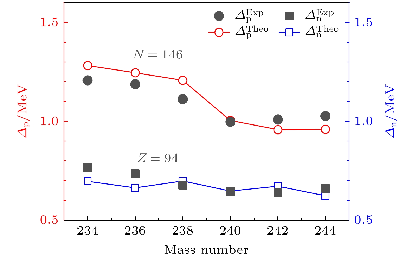 • 图 1  $ Z=94 $的偶偶核中子对隙(蓝色空心方框)和实验上提取的中子经验对隙(黑色实心方框)随质量数的变化. $ N=146 $的偶偶核的质子对隙(红色空心圆)和实验上提取的质子经验对隙(黑色实心圆)随质量数的变化