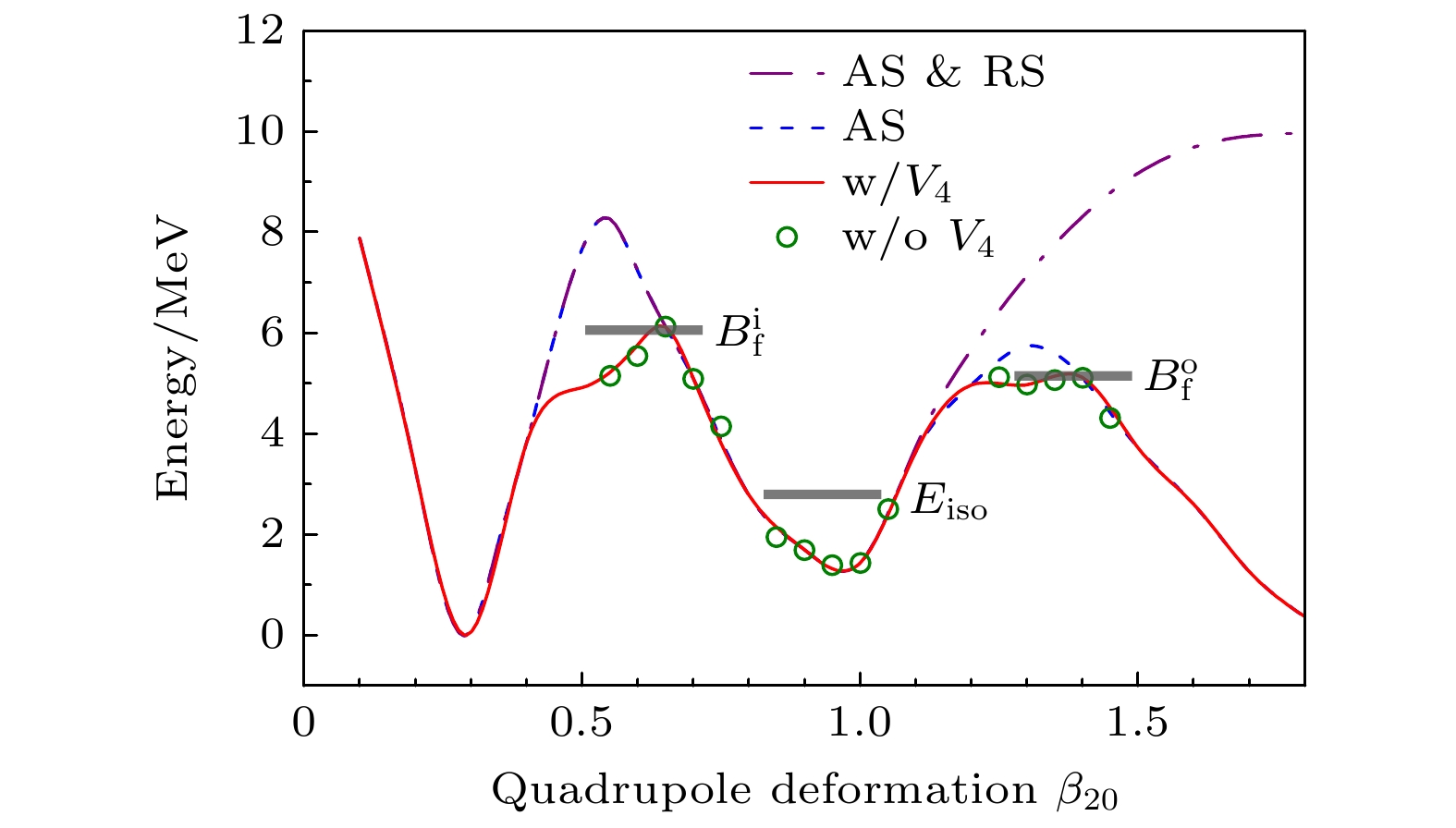 图 2  $ ^{240}{\rm{Pu}} $分别在保持轴对称和反射对称性(紫色点划线), 轴对称性(蓝色短划线), $ V_{4} $对称性(红色实线)时的势能曲线以及$ V_{4} $对称性破缺后在裂变内垒, 外垒和同核异能态附近的势能(绿色空心圆). 经验裂变内垒$ B_f^i $, 外垒$ B_f^o $, 和同核异能态$ E_{{\rm{iso}}} $的能量由黑色横线标记. 取$ ^{240}{\rm{Pu}} $的基态能量为$ 0 $