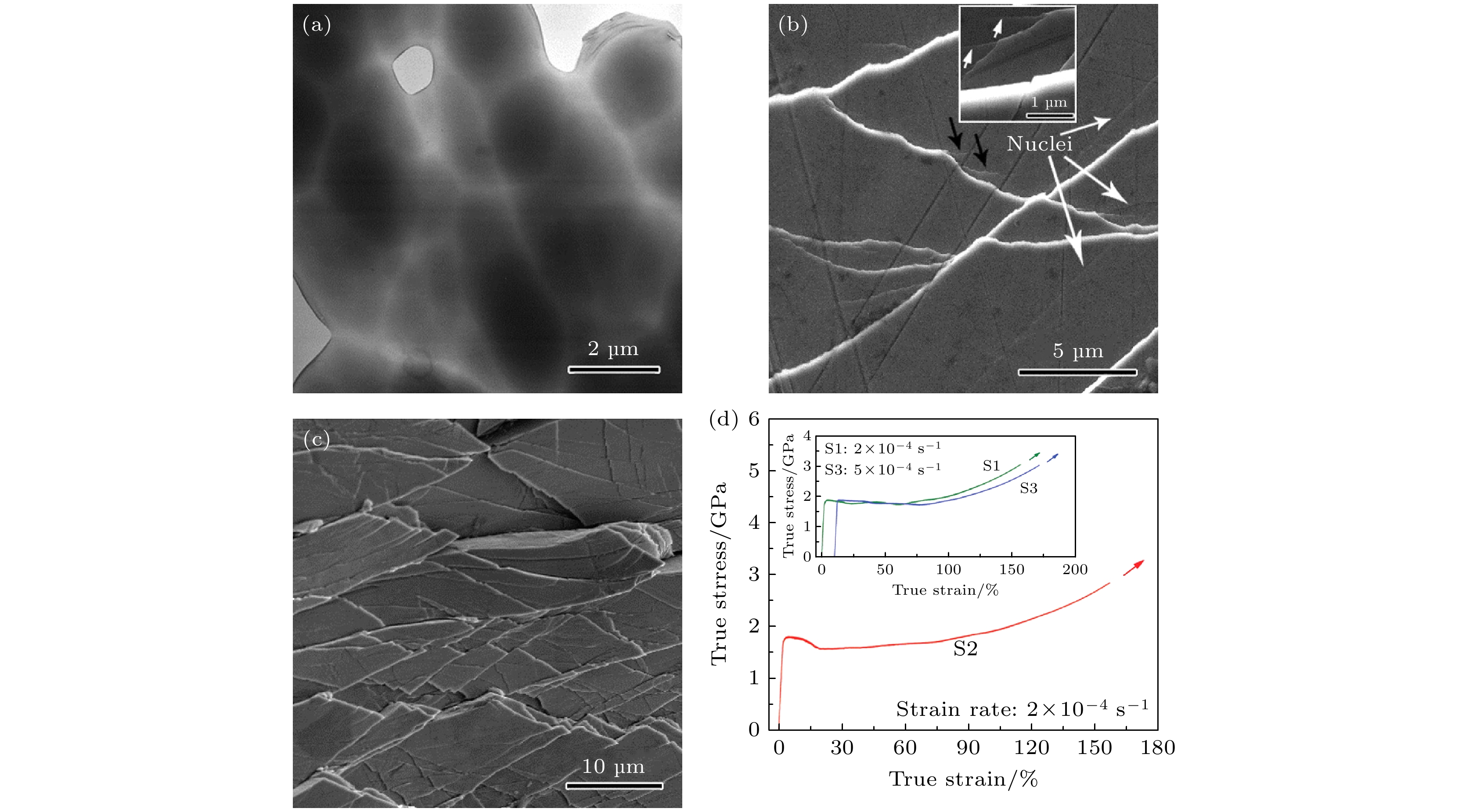 Fig. 1. Micrographs of the Zr–Cu–Ni–Al amorphous alloy and the true stress–strain curve of the specimen: (a) TEM image of the specimen showing dark regions surrounded by bright regions (corresponding to hard and soft regions, respectively); some of the soft regions have been thinned into pores[25]; (b), (c) scanning electron microscopy (SEM) images of the specimen surface corresponding to true plastic strains of ~2.7% and ~159, respectively. In Figure (b) the shear bands are wavy, black arrows indicate winged shear bands, and the inset shows winged shear bands propagating along a prematurely formed wavy shear band (arrow)[25]; (d) true stress–strain curve of the specimen tested at room temperature[25].