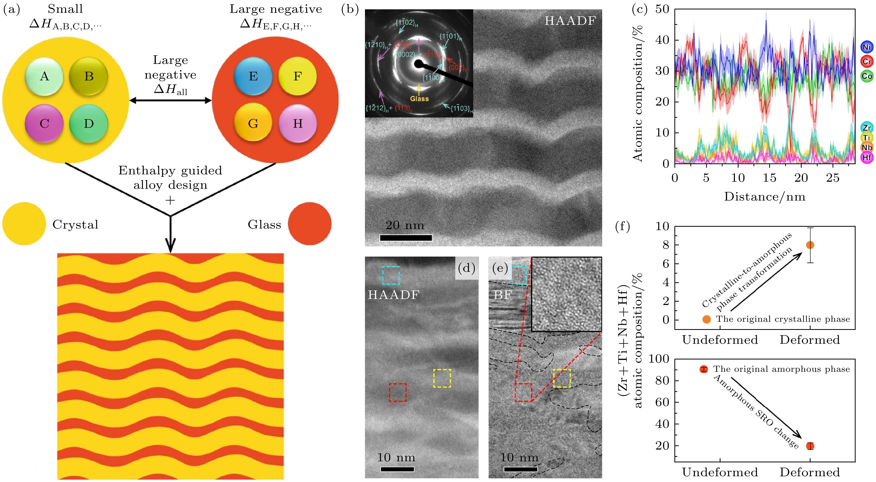 Fig. 4. Elemental-partitioning-mediated CA-TRIP phase-transformation process in a Cr–Ni–Co (crystalline)/Zr–Ti–Nb–Hf–Ni–Co (amorphous) nanolayered composite: (a) Schematic illustration of the alloy design strategy[68]; (b) representative side-view high-angle annular dark-field scanning transmission electron microscopy (HAADF-STEM) image showing the nanolamellar structure; the inset is the corresponding SAED pattern, consisting of amorphous halos and indexed FCC/HCP planes[68]; (c) APT map of the dual-phase structure[68]; (d) cross-sectional HAADF-STEM image of the deformed material, with the crystalline region highlighted by the red box and the amorphous region by the yellow box[68]; (e) corresponding bright-field STEM (BF-STEM) image of Figure (d); the inset shows an enlarged view of the red dashed square, revealing the amorphous structure[68]; (f) Total concentrations of Zr, Ti, Nb, and Hf in the crystalline and amorphous phases before and after deformation[68].
