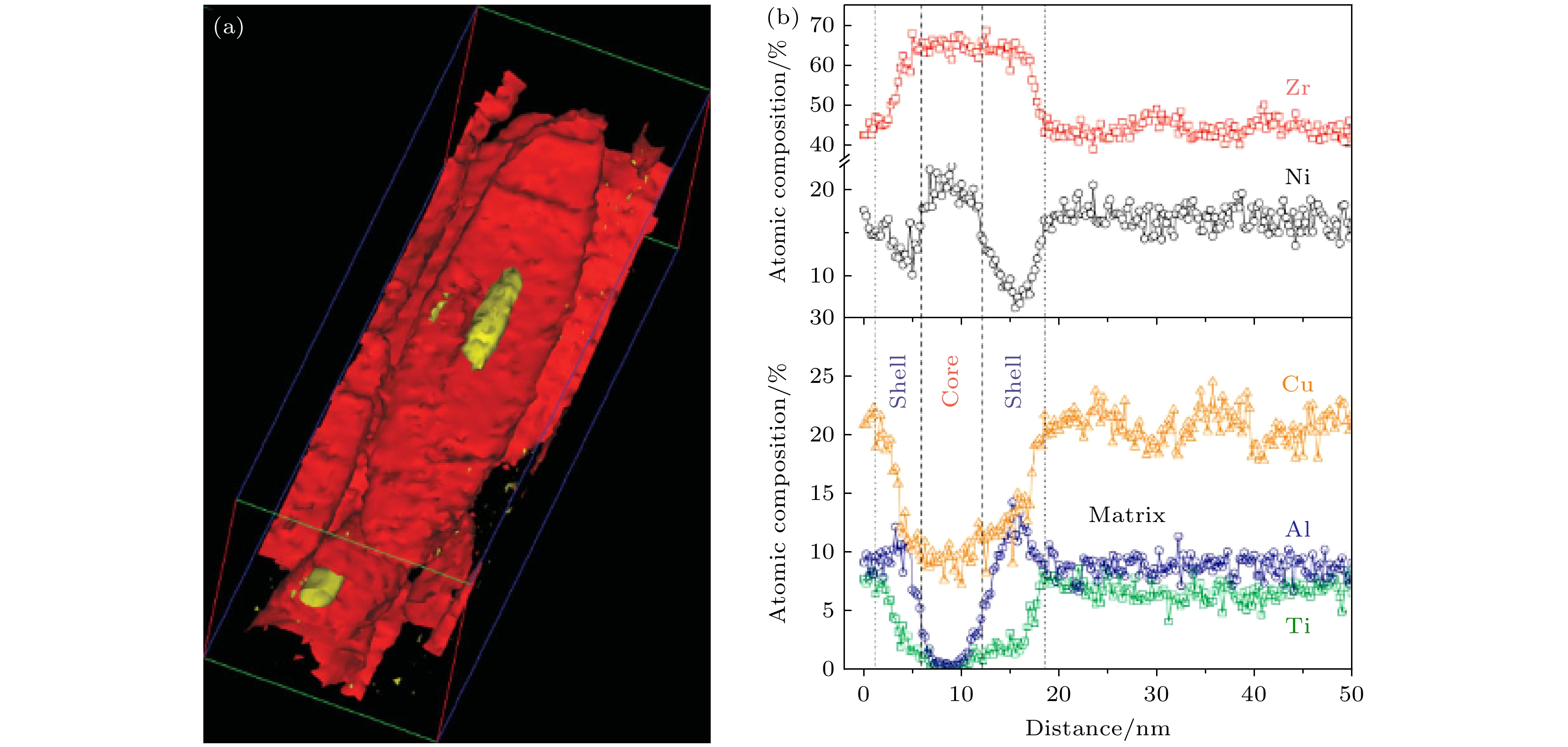 Fig. 5. Atom probe tomography (APT) image of the Zr–Cu–Ni–Al–Ti amorphous–nanocrystalline material, showing a core–shell structure: (a) Isoconcentration surfaces determined by APT analysis, showing a lens-shaped Zr-rich precipitate with an Al-enriched core. The red isoconcentration surface (52% Zr, atomic percent) corresponds to the precipitate/matrix interface, while the yellow isoconcentration surface (5.4% Al, atomic percent) delineates the precipitate/core interface[71]; (b) one-dimensional compositional profile across the center of the lens-shaped precipitate. Al atoms are depleted from the core, whereas Ti atoms are rejected from both the core and the surrounding shell[71].