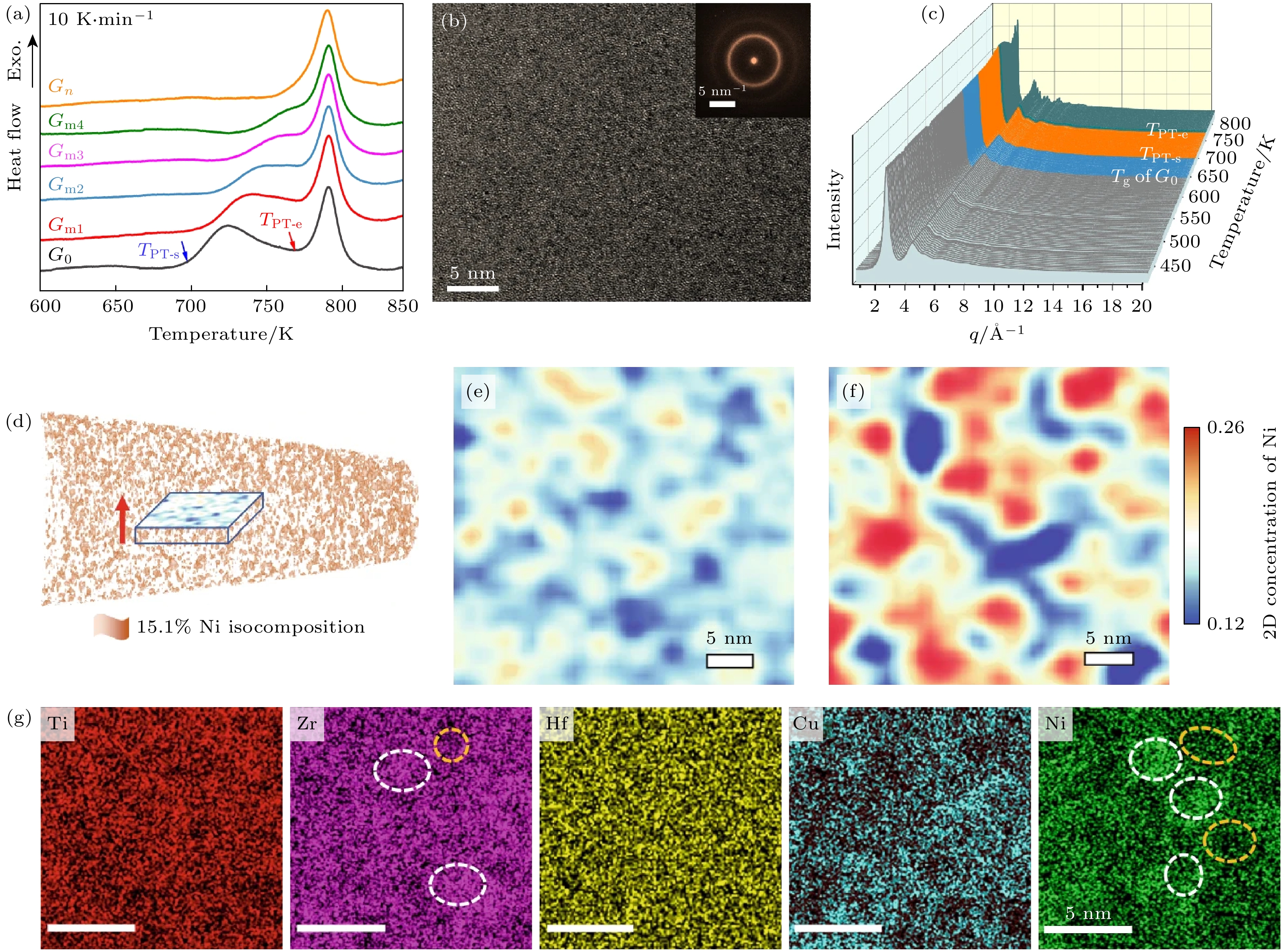Fig. 7. Continuous polymorphic-transformation process of the Ti–Zr–Hf–Cu–Ni high-entropy amorphous alloy: (a) In situ DSC traces of the as-prepared TiZrHfCuNi high-entropy amorphous alloy (HEMG, G0) and samples preheated at 713, 726, 740, 753, and 771 K (denoted as Gm1–Gm4 and Gn, respectively)[50]; (b) HRTEM image of sample Gn with the corresponding SAED pattern[50]; (c) synchrotron XRD patterns collected at different temperatures, with phase transition intervals highlighted in different colors[50]; (d) APT tip reconstruction of G0with an isocomposition threshold of 15.1% [50]; (e), (f) two-dimensional Ni concentration maps over a 40 nm×40 nm× 5 nm volume for G0 and Gn, respectively[50]; (g) HAADF-EDS mappings of each element in Gn, where the white and yellow dashed circles indicate regions with relatively high and low elemental concentrations, respectively[50].