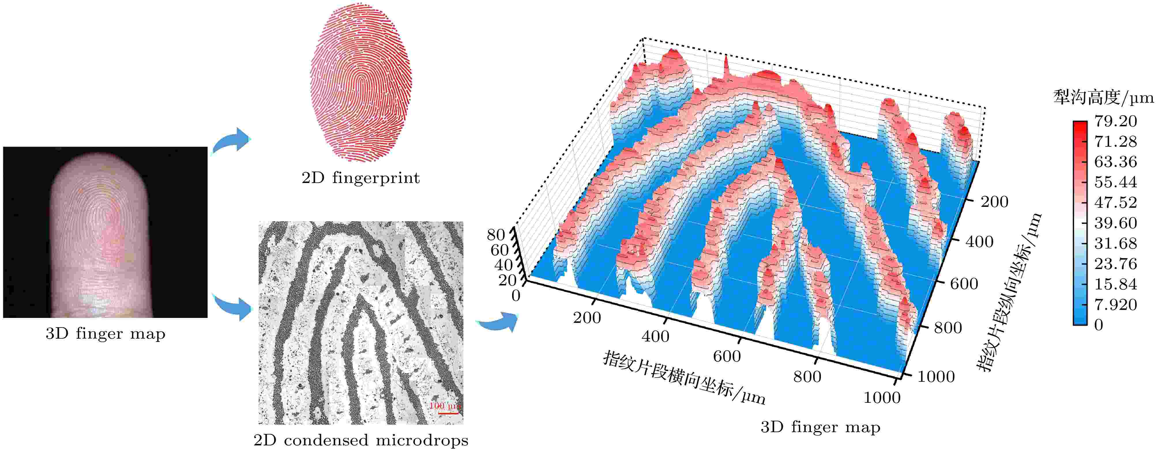 指纹识别技术作为现代生活安全和信息保护的关键手段, 已广泛应用于日常生活的诸多领域. 传统2D指纹信息承载量不足, 难以满足高安全性需求. 近年提出的几种3D指纹技术虽各有优势, 但采样程序复杂且依赖于大型设备等问题限制了其实际应用. 本文提出一种基于冷凝微液滴群的简单快速三维指纹片段重构技术, 表明按压冷表面时指纹犁沟约束的水蒸气通过扩散凝结所形成的冷凝微液滴群蕴含着三维指纹信息, 并根据冷凝微液滴群的大小分布重建指纹片段. 通过与实测的指纹三维数据对比分析, 发现重构获取的数据与真实的指纹数据误差仅为9.3%, 具有良好的一致性. 该三维指纹重构方法可以便捷获取高信息承载量的指纹片段用于生物个体确认, 随着技术的不断优化和完善, 这一方法有助于在身份认证、安全防范及个人信息保护等领域发挥重要作用.