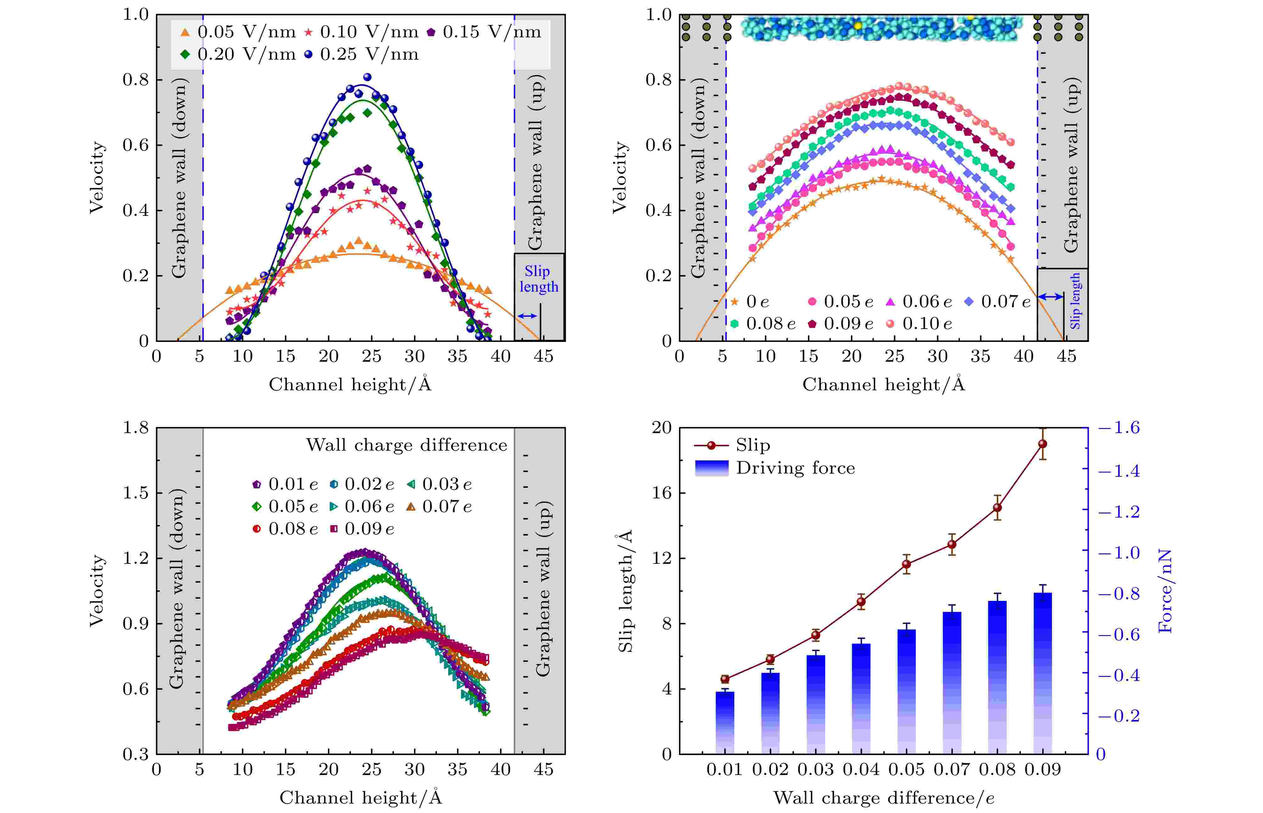 电渗流通过改变流固界面的双电层效应, 使流体在通道内产生高剪切率从而驱动界面处产生大的滑移速度. 本文采用分子动力学模拟构建电渗流纳米通道模型, 研究了石墨烯带电壁面纳米通道内流体流动特性与壁面滑移减阻特性. 结果表明, 电渗流改变了双电层结构增加其扩散层的可移动性; 同时在电场作用下扩散层的离子定向迁移, 通过黏性作用带动整体流动, 增大了流体的流动性能. 引入离子后, Na+在壁面处吸附削弱流体与壁面之间的吸附力, 从而提升流体在限域空间的驱动力, 增大离子溶液滑移长度和流速. 最终提出了一种通过调控石墨烯非对称壁面电荷实现通道内溶液超快运输的方法, 成功地实现了石墨烯通道内溶液电渗流的滑移减阻效果. 为纳米限域空间内微流体的快速节能输运提供了理论依据.