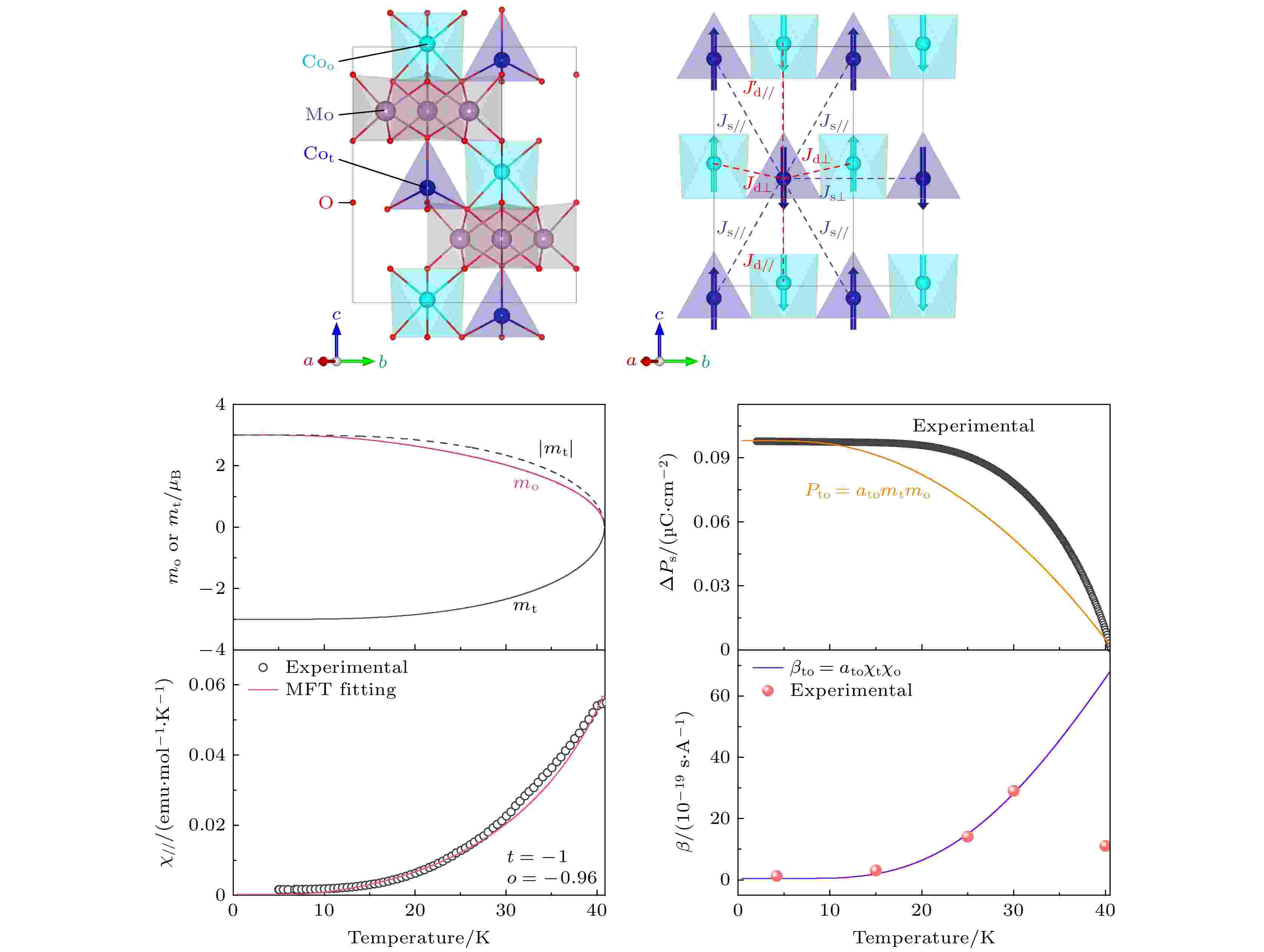 近年来, 极性磁体M2Mo3O8 (M: 3d过渡金属)因其独特的晶体结构、多重连续的磁电耦合态转变及潜在应用价值, 成为凝聚态物理和材料科学领域的研究热点. 特别是Co2Mo3O8基态下展现出显著的二阶非线性磁电耦合效应, 对应独特的磁电耦合微观机制和实际应用价值. 本文基于分子场唯象模型, 构建了Co2Mo3O8体系的两套不同的反铁磁子格子, 给出体系的自发磁矩、自旋诱导的铁电极化、一阶线性磁电耦合系数以及二阶非线性磁电耦合系数随温度的变化关系. 结果显示Co2Mo3O8的二阶磁电耦合系数要明显比同构的Fe2Mo3O8以及Mn2Mo3O8大, 这主要是因为Co2Mo3O8的两个不同子格子间的反铁磁交换作用能量更低, 体系所处的状态更加稳定. 这也表明, Co2Mo3O8体系拥有更加稳定的不可逆性, 展现了非常明显的磁电二极管效应, 为磁电二极管的发展提供了坚实的理论和实验基础.