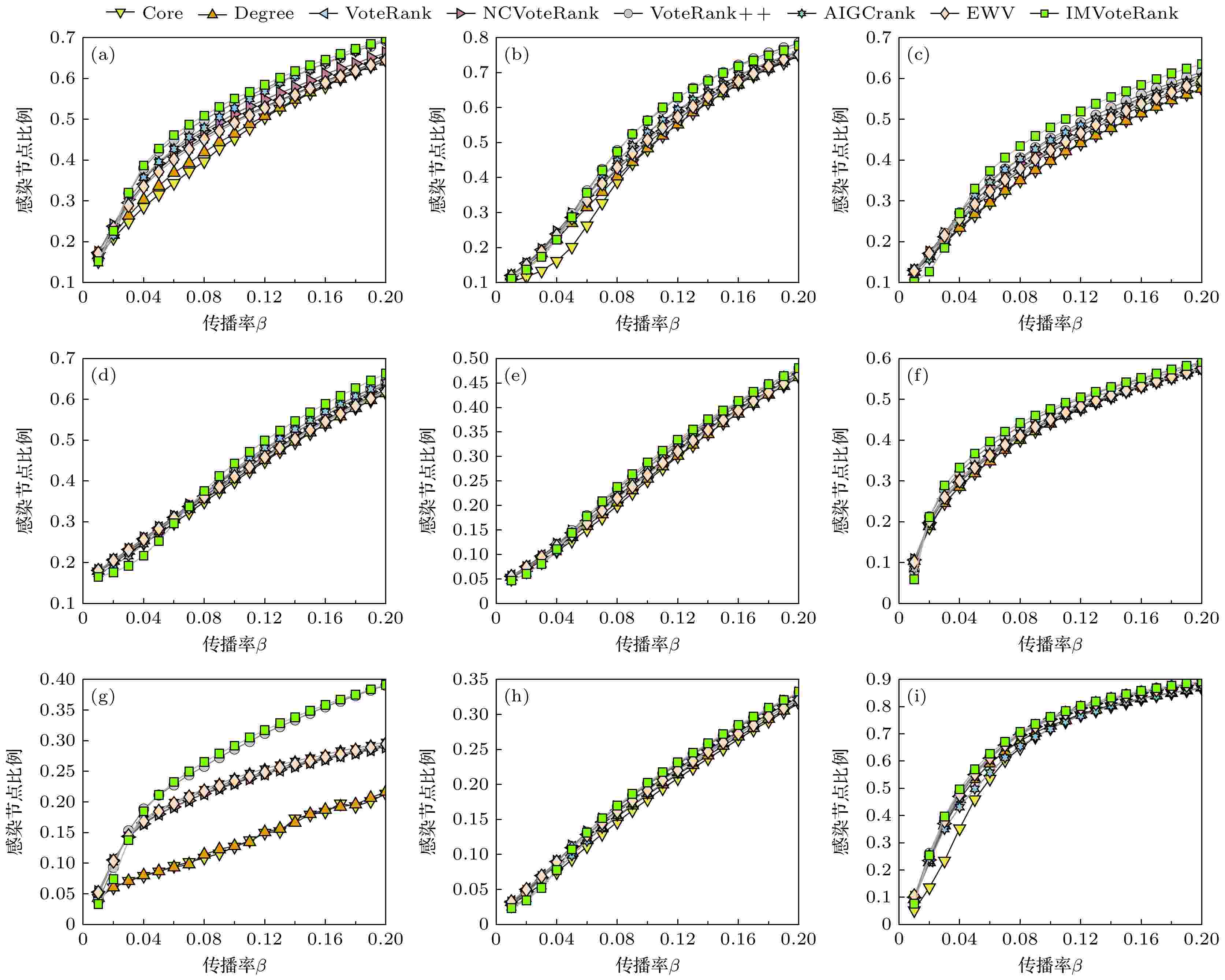 在复杂网络中高效识别一组关键传播节点对信息扩散与谣言控制至关重要. 对于多传播源节点选取问题, 一种有效的方法不仅要考虑种子节点自身的影响力, 还要考虑其分散性. 传统投票模型算法VoteRank假设一个节点对其每个邻居的投票都是一样的, 忽视了拓扑相似性对投票倾向的影响; 其次, 采用邻域均质化投票衰减策略, 难以有效地抑制种子节点的传播范围重叠. 本文提出一种改进的基于VoteRank的复杂网络多影响力节点识别算法IMVoteRank, 通过双重创新提高算法效果: 首先, 设计基于结构相似性的投票贡献机制, 模拟真实世界中选民更倾向于投票给自己关系相近的人, 算法认为节点之间拓扑结构越相似邻居节点越有可能将票投给对方, 因此将邻居节点的投票贡献拆分为直接连接贡献与拓扑相似性贡献, 通过动态权重平衡二者的贡献从而优化投票精准度; 其次, 引入动态群组隔离策略, 在迭代过程中以种子节点为核心检测紧密连接群组, 通过抑制群组内节点投票能力并断开其连接, 保证种子节点的空间分散性从而有效克服了传播范围重叠问题. 在多个真实数据集上基于易感-感染-恢复模型的传播实验证明, 所提方法能更有效识别网络中多影响力节点.