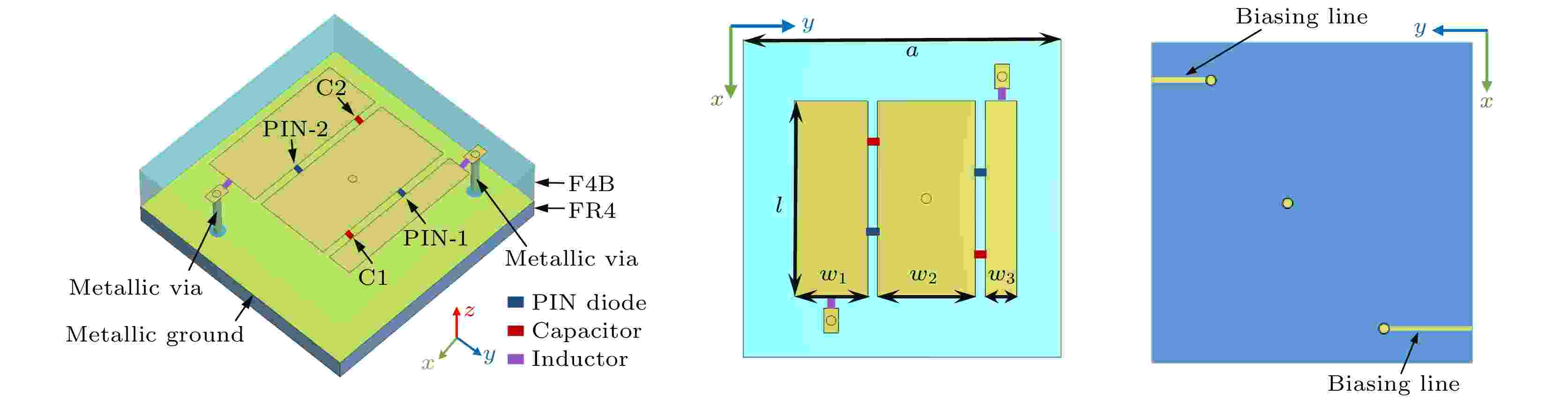 提出了一种频率和相位复合可重构的超表面设计方法. 该方法在超表面单元引入N个PIN二极管, 借由其通断改变单元的谐振特性, 形成2N个可调控的反射相位, 选择适当的结构参数, 可以使2N个反射相位在不同频带内呈现出180°相位差, 综合利用频率和相位调控特性, 即可有效扩展可重构相移超表面的工作带宽. 采用该方法, 设计了一款超宽带1比特相移超表面单元, 其1比特相位的调控频段覆盖5.4—13.0 GHz, 相对带宽为82.6%, 通过引入集总电容和优化其位置, 精准改变电流分布, 实现了单元的低损耗性能. 该单元的厚度仅为0.09λ, 其具有低剖面、低成本、低损耗特点. 进一步利用该单元构造了16 × 16单元的超表面, 通过不同的阵列编码, 超表面能够产生散射可控波束和轨道角动量涡旋波, 并在超宽带范围内实现了10 dB以上的雷达散射截面减缩效果, 展现出动态灵活的波束调控和低散射性能.