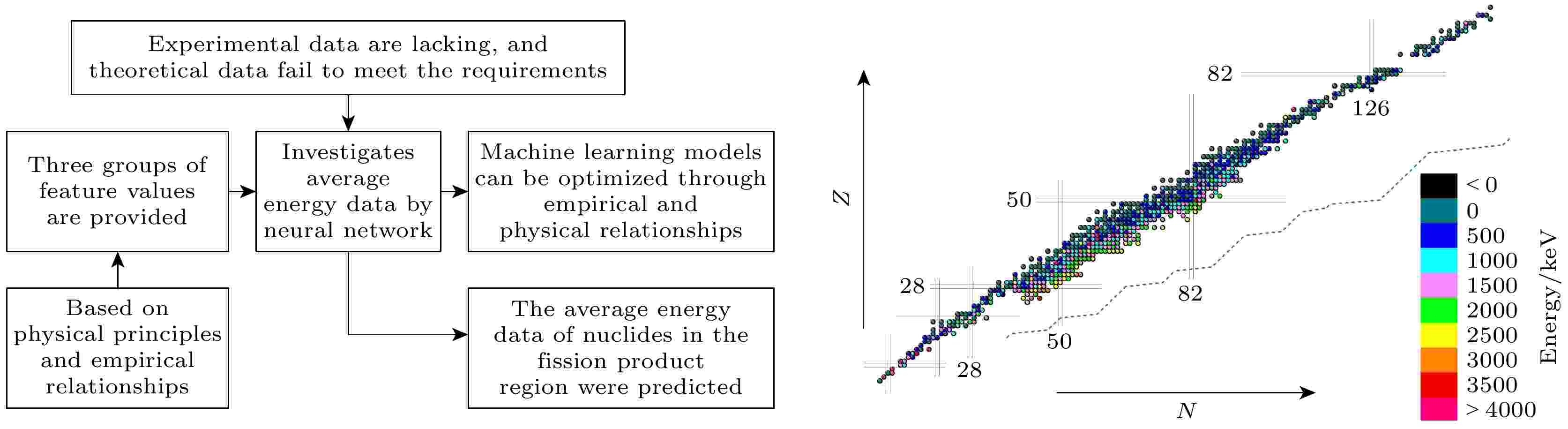 核素β–衰变释放的β粒子与γ射线平均能量是计算反应堆衰变热的核心参数, 对核设施安全与工程应用至关重要. 然而, 许多核素的实验数据匮乏, 现有理论模型精度难以满足需求. 本文基于ENSDF数据库中543个实验数据准确的β–衰变核素(选自1136个β–衰变核素), 采用神经网络方法对核素衰变发射的β粒子、γ射线及中微子的平均能量进行预测, 对比了三种特征组(分别含特殊特征值$T_{1/2}$, $({1}/{T_{1/2}})^{1/5}$, $Q/3$)的模型性能. 结果表明: 相比特征组含$T_{1/2}$以及$({1}/{T_{1/2}} )^{1/5}$的模型, 特征组含$Q/3$的模型综合表现最佳, 其β粒子与中微子预测误差分别为28.11%/56.9%和35.33%/37.76%, 并且利用该特征组训练的机器学习模型成功补充了裂变产物区(质量数66—172) 291个核素的缺失数据. 核素图对比显示, 神经网络对规律性较强的β粒子及中微子能量预测与实验符合较好, 但对γ射线(训练误差76.9%)以及奇奇核、幻数附近核素的预测偏差显著. 本文证实经验特征值$Q/3$可有效提升模型性能, 同时揭示了数据规律性与模型泛化能力的关联, 为后续融合物理机理优化机器学习模型提供了依据.