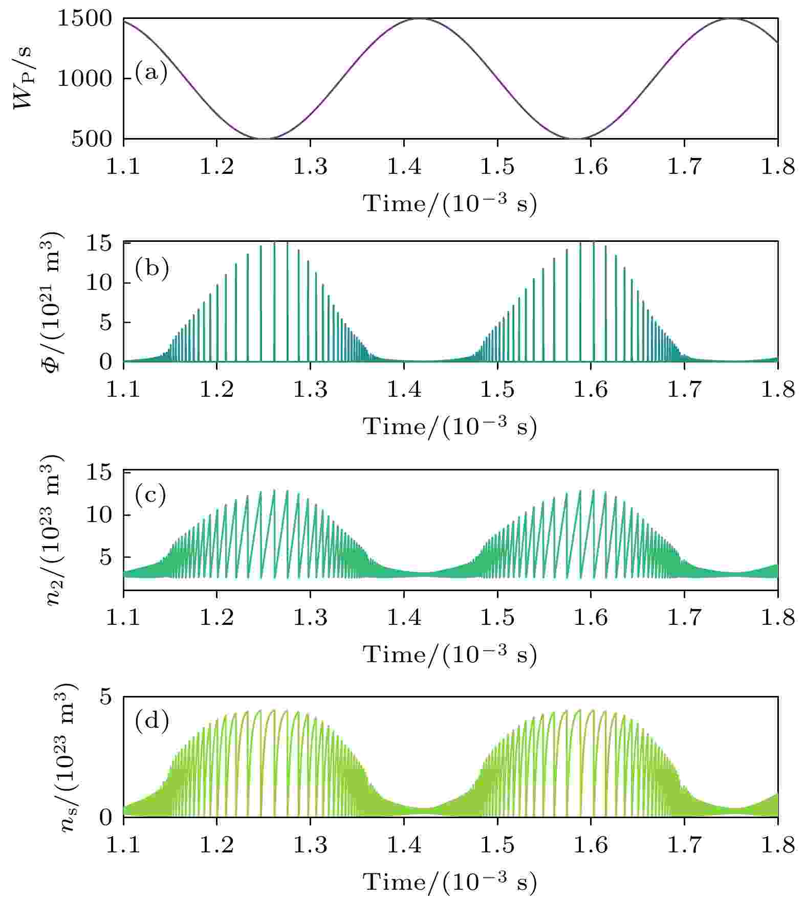 全固态被动调Q激光器的非线性动力学行为是影响其输出特性的关键因素. 本文通过数值模拟研究了泵浦调制下全固态被动调Q Nd:YAG/Cr:YAG激光器的非线性动力学行为, 讨论了关键调制参量对调Q激光非线性动力学及其输出特性的影响. 仿真结果表明, 在特定的调制频率、调制幅度以及未调制泵浦速率下, 调Q激光可以表现出单周期态、倍周期态、多周期态以及混沌态. 通过分析调Q激光脉冲峰值随调制频率、调制幅度以及未调制泵浦速率变化的分岔图, 发现脉冲峰值主要经倍周期和准周期演化路径进入混沌. 此外, 脉冲频率(即相邻脉冲时间间隔的倒数)进入混沌的演化路径与脉冲峰值的演化路径一致, 但脉冲频率强度变化趋势与脉冲峰值强度变化趋势相反. 研究结果理论上揭示了泵浦调制关键参量对激光器的非线性动力学行为及其输出特性具有显著影响, 并为进一步实验深入探究其演化机制提供了重要的指导.