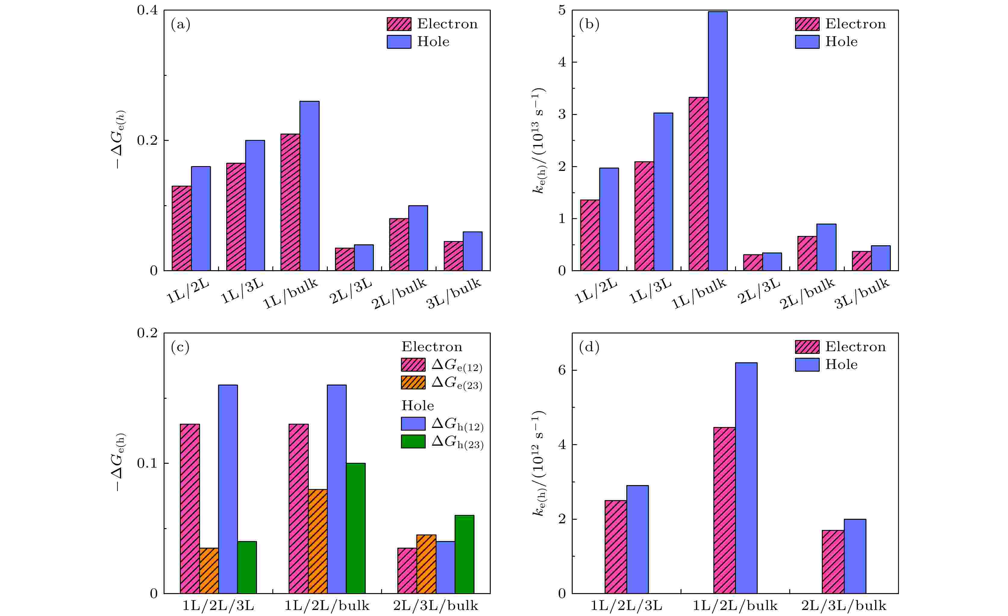 二维层状材料的能带漏斗效应为调控电荷转移提供了重要手段. 然而, 关于能带漏斗的实现及其对电荷转移速率的影响仍缺乏理解. 本文通过解析推导和第一性原理计算方法, 提出通过构建具有厚度梯度的MoS2实现能带漏斗效应, 并分析能带漏斗效应对电荷转移速率的影响. 结果表明, MoS2的带隙随层数减少呈单调递增趋势, 使得双厚度梯度和三厚度梯度MoS2均可实现能带漏斗效应, 电荷会从薄层区域往厚层区域定向传输. 此外, 不同层数MoS2界面处能级差诱导的驱动力是调控载流子聚集能力的重要因素, 在双厚度梯度单层/块体MoS2的电荷转移速率可达$ 4.97 \times {10^{13}}{{\text{ s}}^{ - 1}} $. 这些结果为设计能带漏斗以及理解能带漏斗效应调控电荷转移行为提供物理基础.