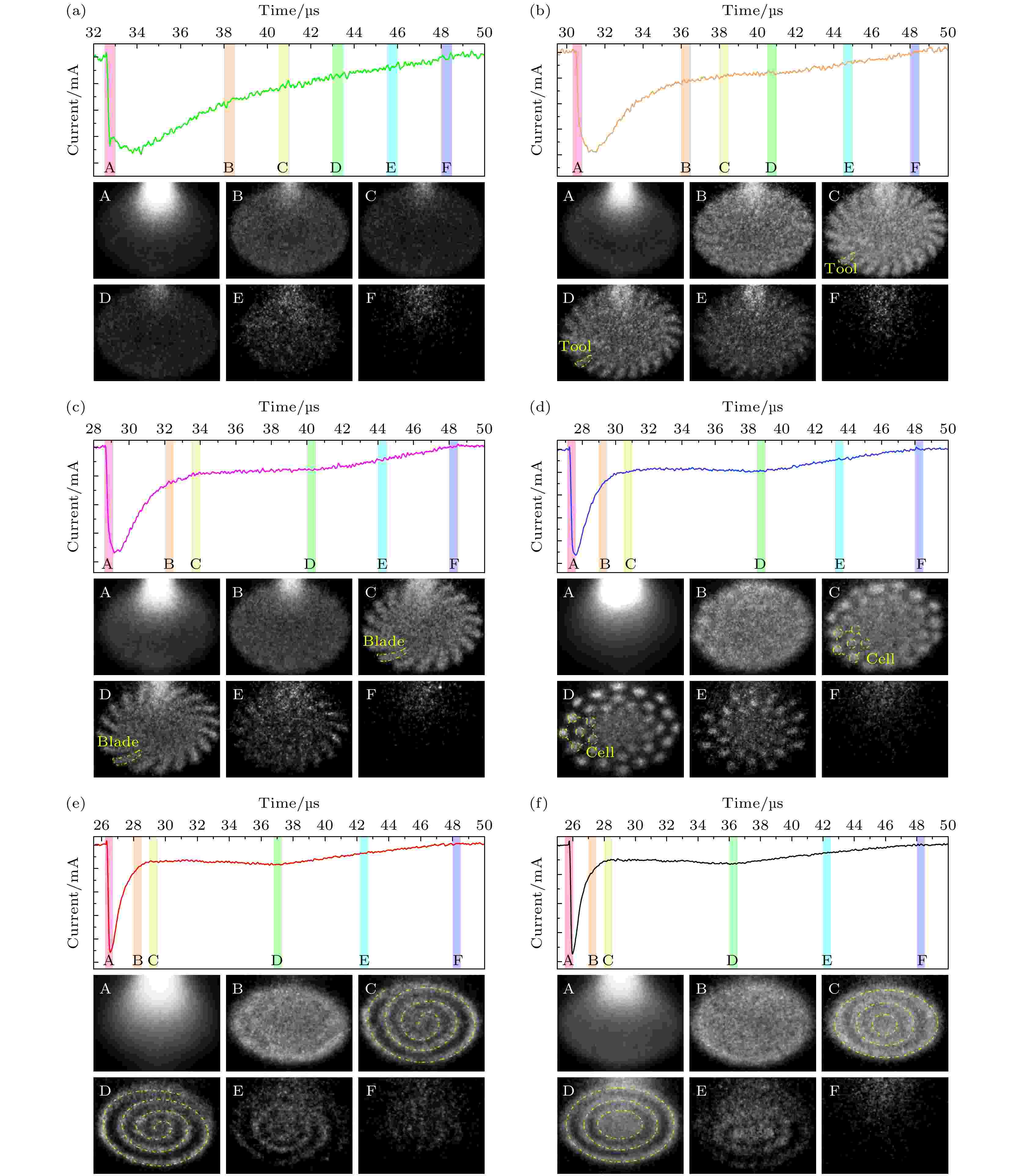 本文利用正弦交流电压激励液体电极放电系统, 通过增大液体电导率(σ), 发现放电从均匀模式过渡为斑图模式, 且斑图模式中依次在液面观察到了齿轮、锯盘、离散点、单臂螺旋和同心圆环等结构. 放电的电压电流波形表明放电仅发生在电压的负半周期(液体作瞬时阳极), 气体击穿后放电电流迅速增大并很快达到峰值然后缓慢减小. 对于均匀模式, 放电电流的减小是单调的; 但对于斑图模式, 放电电流在减小过程中存在一段几乎不随时间变化的平台阶段. 此外, 随σ升高, 峰值电流和平台电流均增大, 且放电击穿时刻提前. 利用增强型电荷耦合设备拍摄了均匀模式和斑图模式在液面附近的时间演化行为, 发现不论何种放电模式最初液面上均产生的是均匀圆盘, 而各种非均匀的斑图是产生在平台阶段. 基于反应-扩散模型, 通过改变离子强度与电流强度(对应变量m和l )对均匀模式和斑图模式进行了数值仿真, 获得了实验对应的放电模式. 此外, 采集了液面附近放电的发射光谱, 计算了与电子温度和电子密度相关的谱线强度比. 通过对光谱进行拟合, 获得了液面附近放电的气体温度和分子振动温度. 研究发现这些等离子体参数随σ的增大(对应着放电模式的变化)而升高.