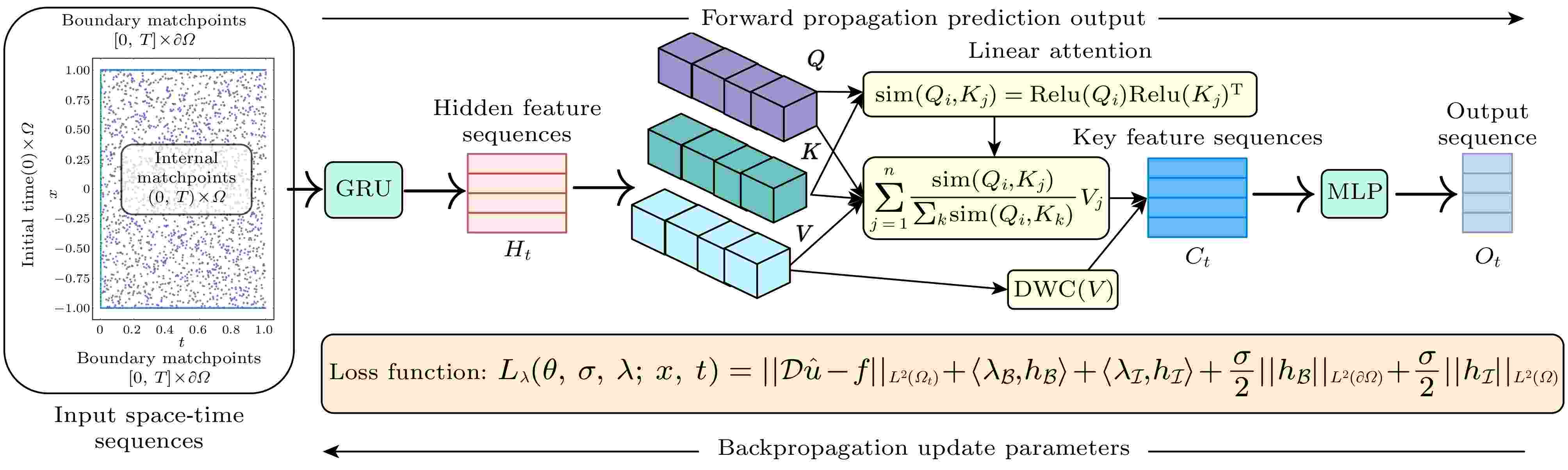 物理信息神经网络(PINNs)作为人工智能助力科学研究(AI for Science)求解偏微分方程(PDEs)的一种无网格化求解框架, 近年来受到广泛关注. 然而, 传统PINNs存在局限性: 一方面, PINNs网络结构使用单向信息传递的多层感知机(MLPs), 难以有效聚焦序列数据中蕴含的关键特征, 信息表征能力弱; 另一方面, PINNs的损失函数为嵌入物理约束的二次罚函数, 其未受约束而无限膨胀的惩罚因子影响模型训练寻优效率. 为应对上述挑战, 本文提出一种基于信息表征-损失优化改进的PINNs—allaPINNs, 旨在增强模型关键特征提取和训练寻优能力, 提升其求解PDEs数值解的准确性和泛化能力. 在信息表征方面, allaPINNs引入高效线性注意力(LA)增强模型关键特征识别能力, 同时降低权重动态加权的计算复杂度. 在损失优化方面, allaPINNs通过引入增广拉格朗日(AL)函数重构目标损失函数, 利用可学习的拉格朗日乘子和惩罚因子有效调控各损失残差项的相互作用. 由Helmholtz, Black-Scholes, Burgers和非线性Schrödinger四个基准方程验证allaPINNs的有效性. 结果表明, allaPINNs能够有效求解不同类型PDEs, 并展现出卓越的数值解预测精度与泛化能力. 相较于当前先进PINNs, 其预测精度提升一至两个数量级.