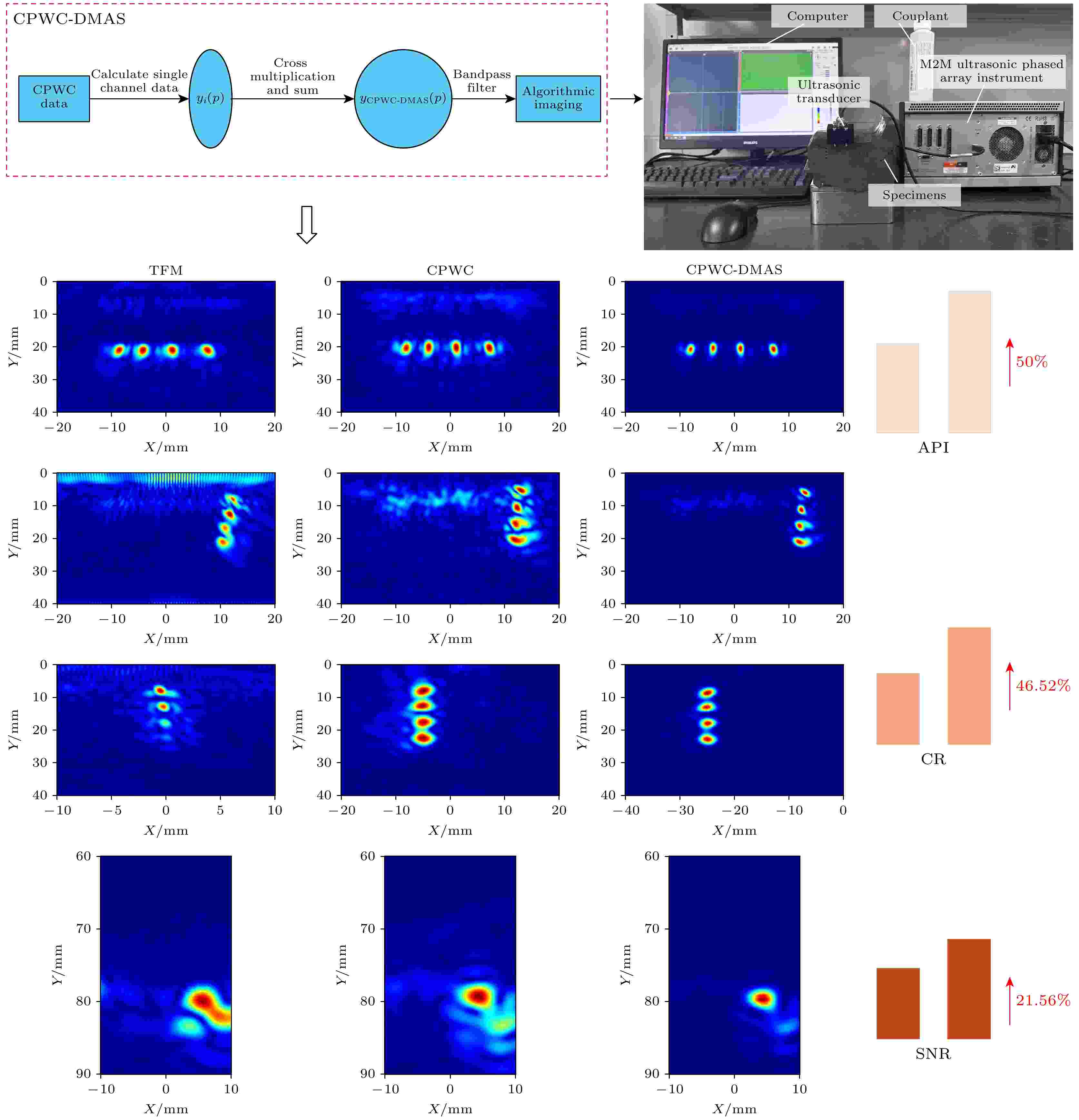 平面波成像因其数据采集速度快, 系统结构简单, 在无损检测中得到广泛应用. 但由于其采用非聚焦发射方式, 声能分布分散, 成像质量较差. 为改善成像质量, 复合平面波成像方法通过多角度平面波的相干叠加来提升成像效果, 但在图像分辨率、对比度以及伪像抑制方面仍存在不足. 为了提高平面波成像质量, 本文提出一种基于复合平面波延迟乘和成像方法(coherent plane wave compounding-delay multiply and sum, CPWC-DMAS). 首先对多个角度的平面波信号进行相干叠加, 实现多角度信息融合. 然后在图像输出中引入空间相干性来提高图像质量, 实现多角度复合平面波的高质量成像. 最后, 对钢轨与车轮构件进行实验验证, 结果表明: CPWC-DMAS算法与全聚焦和复合平面波算法相比, 在阵列性能指标方面提升了51.18%和50%, 在对比度方面提升了50.8%和46.52%, 在信噪比方面提升了25.14%和21.56%, 提高了成像质量和分辨能力.