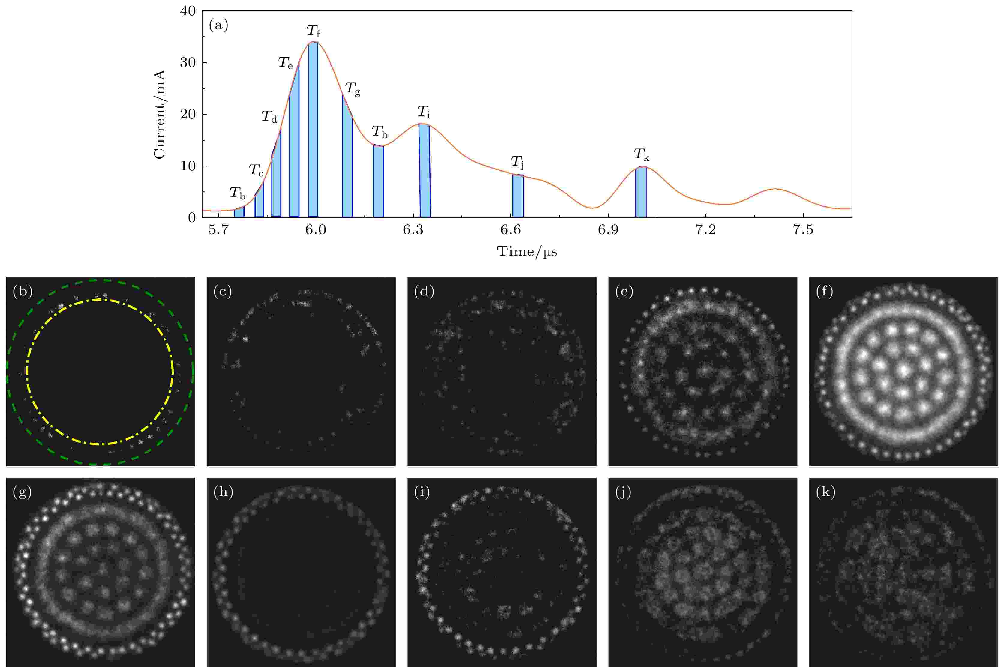本工作在氩气/空气混合气体介质阻挡放电系统中, 利用不同半径的圆形边界叠加形成薄厚组合放电气隙, 通过改变外加电压, 获得同心环斑图、环-点阵-同心环斑图、靶波斑图、蜂窝斑图, 并分析研究了几种斑图的电学特性和光学特性. 利用增强型电耦合设备(intensified charge-coupled device, ICCD)重点研究了环-点阵-同心环斑图的时空演化行为, 对该斑图的形成机理进行了理论分析. 结果表明, 该放电斑图在径向上具有从外向内逐渐点亮的发展过程, 这与薄气隙对放电的预电离作用有关. 对该斑图径向上不同放电细丝的发射光谱进行了采集分析, 并对其等离子体参数进行了空间分辨诊断. 实验发现, 薄气隙中分子振动温度、电子密度及电子温度比厚气隙中大得多. 在厚气隙中沿径向从内到外其分子振动温度、电子密度、电子温度逐渐增加, 但数值变化较小; 薄气隙离圆心更远处的分子振动温度、电子密度、电子温度反而变小, 这与气隙中电场的微变化相关.