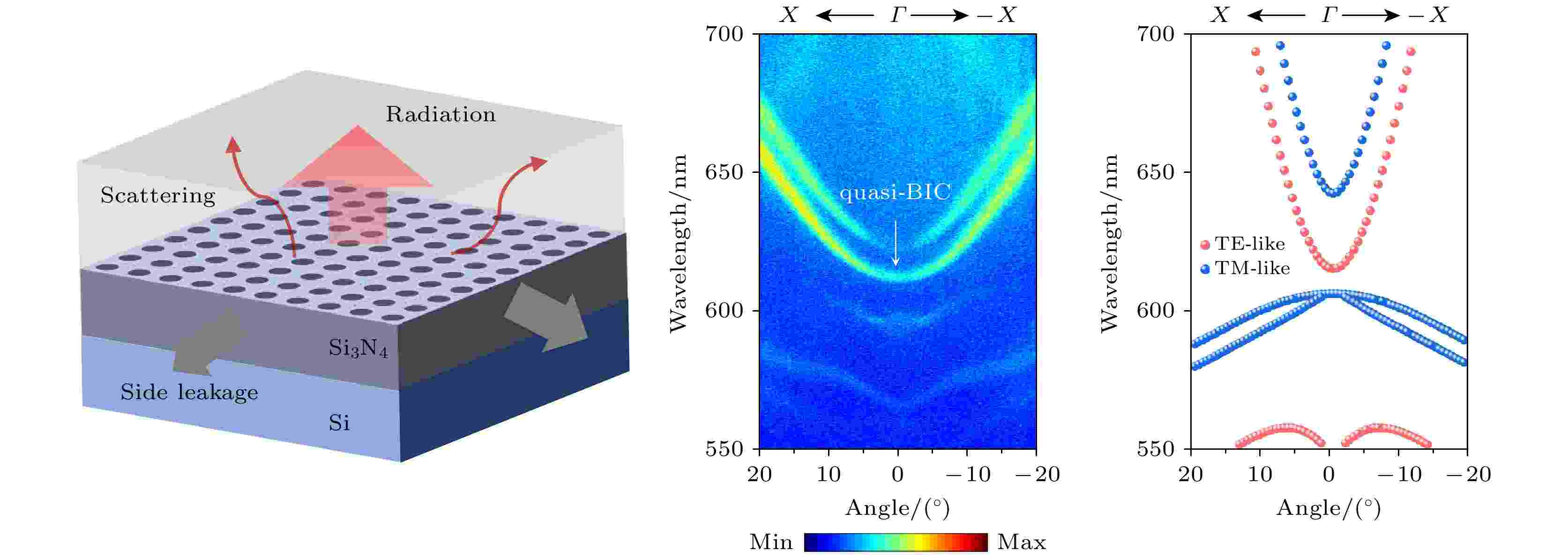 实空间中光子的局域化在基础研究和技术应用领域具有重要意义. 连续域束缚态(bound states in the continuum, BICs)为光子的局域化提供了新的机制, 其中最重要的方案之一是光子晶体. 然而光子晶体在制备过程中会不可避免地引入误差和缺陷, 动量空间表征可以分析加工误差和缺陷对于光子晶体能带特性的影响, 进而指导光子晶体器件的设计和制备. 本文设计了可见光波段的光子晶体, 通过动量空间表征观测到了连续域准束缚态(quasi-BIC), 从而在垂直方向上实现了对光子的高度局域化, 并通过调整结构参数, 实现了对光子晶体动量空间的特征调控. 进一步设计不同周期光子晶体的横向异质结构, 利用两者的能带套嵌实现了对光子水平方向上的局域化, 以此制备了品质因子与模式体积之比达到6 × 1014 cm–3的高品质光学微腔. 本研究对于光子晶体的设计以及增强光与物质相互作用具有重要意义.