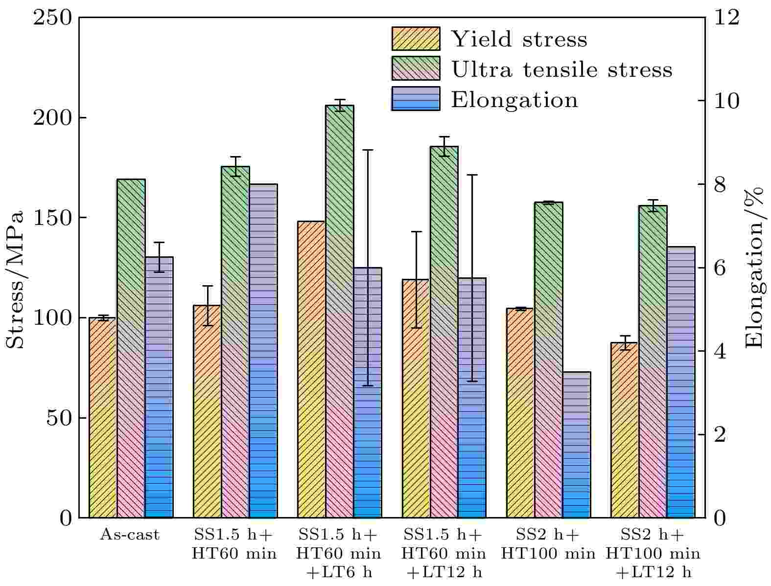 随着电子通信等行业的快速发展, 对高导热铸造铝合金材料性能要求日益增加. 本文以在电子通信等行业广泛使用的Al-7Si(质量分数, 下同)铸造铝合金为对象, 系统分析了热处理工艺制度以及少量的Mg元素添加对Al-7Si系合金微观组织及性能的影响. 结果表明: 固溶后在300 ℃下进行保温热处理有利于共晶Si的球化, 并减小溶质原子在铝基体中的固溶度, 从而导致Al-7Si合金导热性能的提升及硬度的降低; 在Al-7Si合金中添加微量Mg(0.4%)后进行三级热处理(固溶处理+300 ℃热处理+180 ℃热处理)不仅有助于共晶Si的球化, 而且能促使纳米尺度(Mg, Si)强化相的析出以及基体中固溶的Mg, Si元素含量的降低, 从而同时提高合金的力学性能和导热性能. 经历三级热处理的Al-7Si-0.4Mg合金热导率和显微硬度可达189 W/(m·K)和73.5 HV, 相较于铸态Al-Si合金分别提升了11.2%和62.6%.