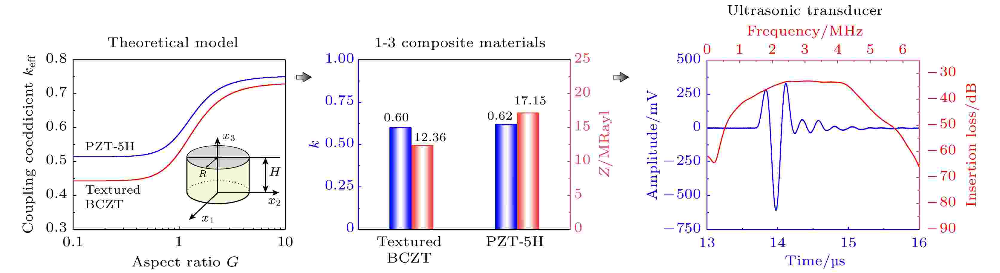 织构(Ba, Ca)(Zr, Ti)O3 (BCZT)陶瓷兼具高压电、高声速和低介电, 十分契合超声换能器高灵敏度和大带宽的发展需求. 然而织构陶瓷普遍缺乏器件设计所需的介电εij、压电dij及弹性常数sij等全矩阵机电参数, 而且现有机电耦合系数k的计算公式仅适用于极端长径比的理想情况, 难以精确描述k随有限长径比的演变规律, 这制约了陶瓷的实际应用. 本工作通过模板籽晶生长法成功制备出沿[00l]C高度取向(织构度f00l ~ 98%)的织构BCZT陶瓷, 通过谐振-反谐振法结合脉冲回波超声测量技术首次建立了完整的全矩阵参数数据库. 织构BCZT陶瓷呈现强各向异性泊松比, 压电系数d33 (605 pC/N)、机电耦合系数k33 (0.73)接近于PZT-5H陶瓷, 压电电压常数g33 (23.6×10–3 V·m–1·Pa–1)较PZT-5H提升20%. 基于压电本构方程构建出k关于任意长径比的理论模型, 据此设计制备的1-3型BCZT复合材料换能器具有高灵敏度和宽频带, 其插入损耗为–33.0 dB, 在~3.0 MHz中心频率处–6 dB带宽高达107.1%, 优于文献报道的PZT-5H超声换能器. 本研究不仅为无铅压电材料的器件化应用提供了完整的机电参数, 且为高性能绿色超声诊断设备的发展奠定了理论与技术基础.