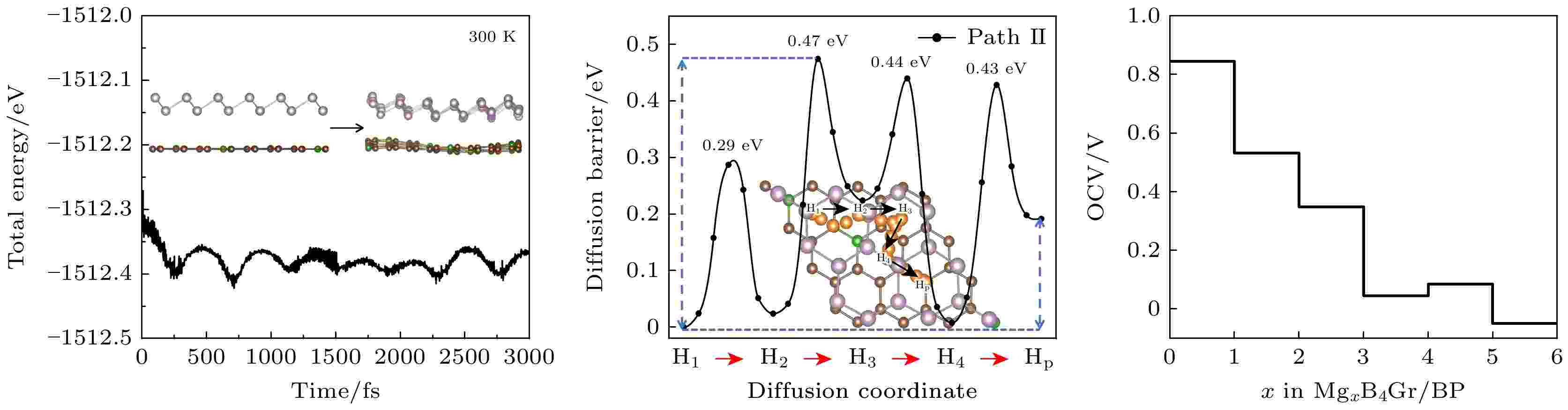 采用基于密度泛函理论的第一性原理计算方法, 讨论了不同浓度硼(B)掺杂石墨烯/蓝磷异质结BiGr/BP (i = 0, 1, 2, 3, 4)的几何结构、稳定性、电子性质以及对镁(Mg)的吸附能力. 结果表明, B掺杂后, 异质结保持结构稳定, 费米能级下移且贯穿多条能带, 材料导电性增强. 随着掺杂浓度的增大, 材料对Mg的吸附能力逐渐增强. 当B掺杂浓度i = 4 (原子个数)时, B4Gr/BP保持热力学稳定, 展现出优异的导电性, 较强的Mg吸附能力(–3.38 eV), 较低的扩散势垒(0.47 eV), 理想的平均开路电压(0.37 V)以及合适的理论容量(286.04 mAh/g). 这表明, B掺杂能有效改善石墨烯/蓝磷(Gr/BP)储镁性能, 特别是B4Gr/BP性能优异, 有望成为镁离子电池阳极的候选材料.