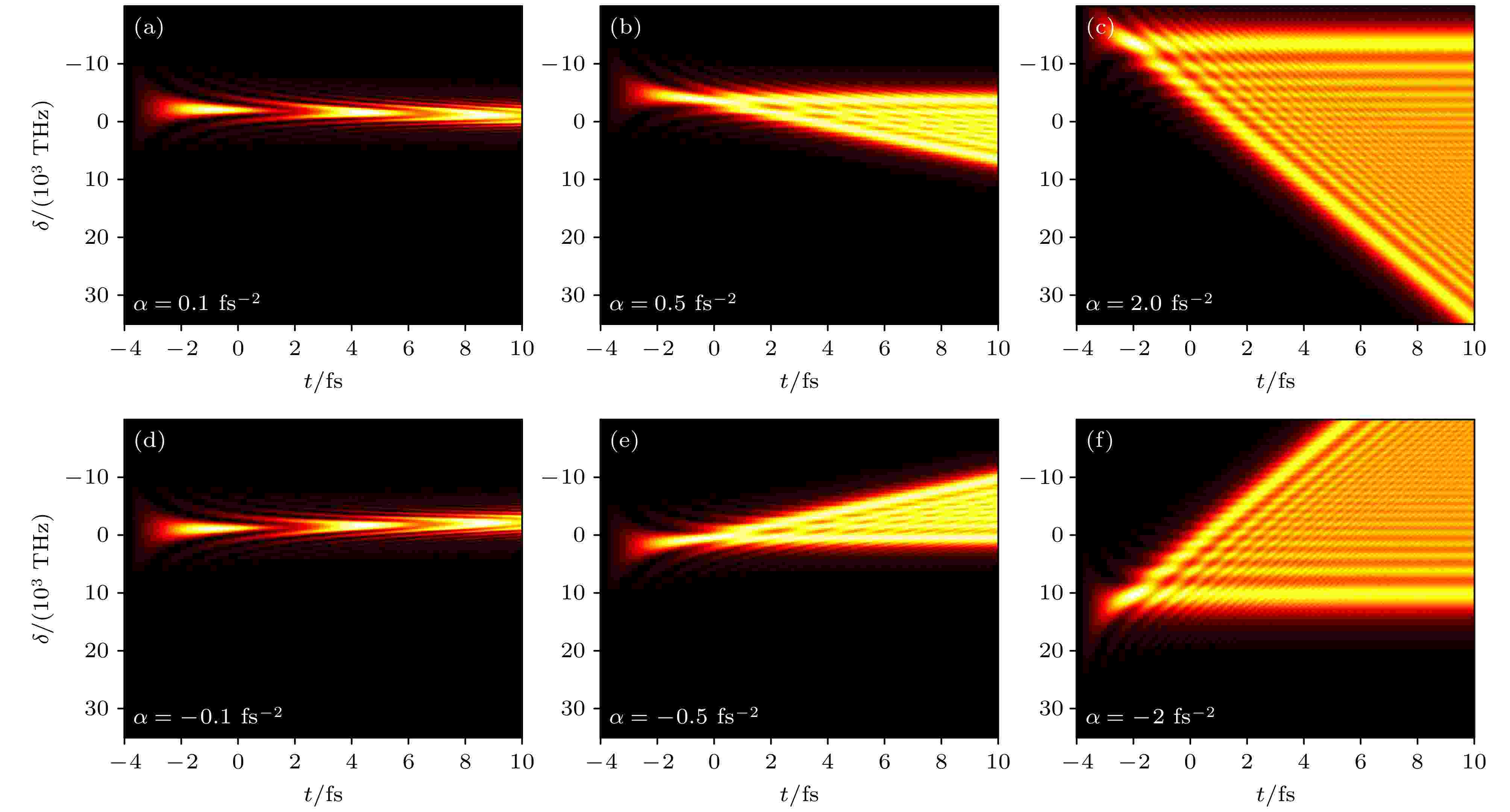 在强场激发的一般情况下, 斯塔克效应对于瞬态双光子跃迁具有重要影响, 且该过程的解析描述具有很大挑战. 本文采用解析求解与数值模拟相结合的方法, 系统研究了弱场和强场啁啾脉冲激发的瞬态双光子跃迁过程, 揭示了光场强度、啁啾因子、失谐量等参数对双光子跃迁概率时域演化的重要影响. 首先, 本文利用二阶微扰理论得到了双光子时域跃迁概率振幅的近似解析解表达式. 该解析解表明, 弱场激发的瞬态双光子跃迁过程类似于菲涅耳直边衍射效应. 随着光场强度的增强, 斯塔克效应对双光子跃迁的影响随之增强. 其次, 本文通过一系列近似处理得到了强场作用下薛定谔方程的近似解析解. 此解析解表明, 强场斯塔克效应引起能级分裂使得双光子跃迁概率时域的对称性遭到了破坏, 其频域过程类似于“双缝干涉”效应. 研究结果表明, 强场激发时布居转移效率与光场强度具有重要关系, 而啁啾因子不仅可以调节布居转移效率和时间位置, 还可以改变布居概率在时域的振荡频率. 这对于强场激发的布居概率时域演化描述提供了新思路, 并对双光子显微成像研究提供了科学依据.
