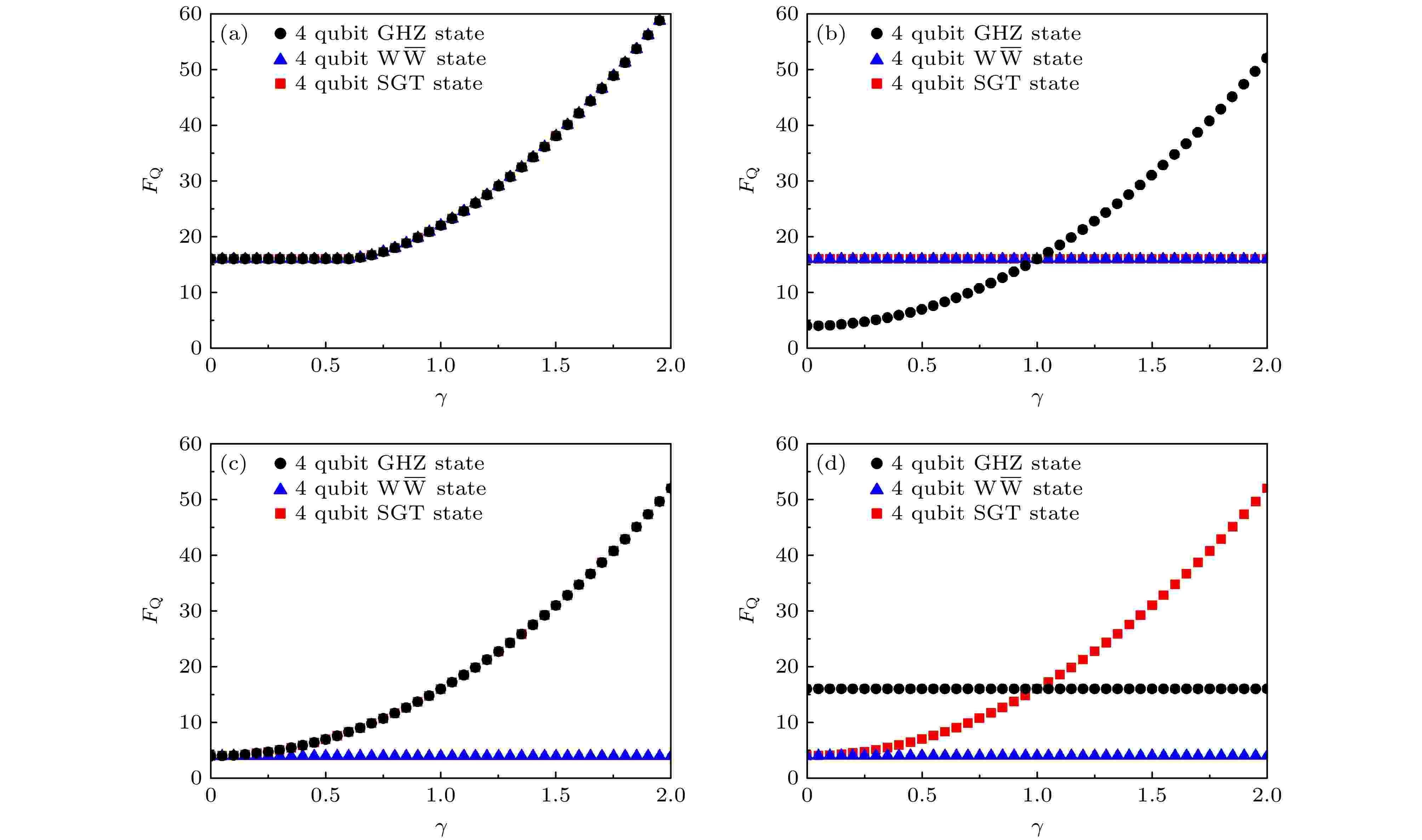 在量子信息领域, 不同纠缠态的判定与分类一直以来就是人们关注的重点课题. 本文借助实验上成熟可控的单轴旋转模型, 对常规局域操作下无法利用量子Fisher信息实现区分的3种特殊纠缠态(4比特GHZ态, 4比特${\mathrm{W}}\overline{{\mathrm{W}}}$态, 4比特SGT态)开展纠缠判定研究. 通过对3种量子态在单轴旋转模型下进行方向优化和相互作用强度调节, 实现了三者的量子Fisher信息区分. 另外, 还研究了4种环境噪声(即比特翻转信道、振幅阻尼信道、相位阻尼信道、去极化信道)对纠缠判定的影响. 结果显示, 在局域操作下, 4比特GHZ态的量子Fisher信息在4种噪声通道中随退相干参数p的变化明显区别于${\mathrm{W}}\overline{{\mathrm{W}}}$态和SGT态, 可以区分; 而${\mathrm{W}}\overline{{\mathrm{W}}}$态和SGT态的量子Fisher信息变化相同, 无法区分. 在单轴旋转模型下, 3种量子态的量子Fisher信息在4种噪声通道下的变化曲线互不相同, 可以明显区分. 需要注意的是, 在比特翻转通道中, 随着退相干参数p的变化, ${\mathrm{W}}\overline{{\mathrm{W}}}$态与SGT态的量子Fisher信息在中间区域($p \approx0.5$)有重叠, 无法区分. 本文的工作为多体系统的量子纠缠判定提供了一种新的思路.