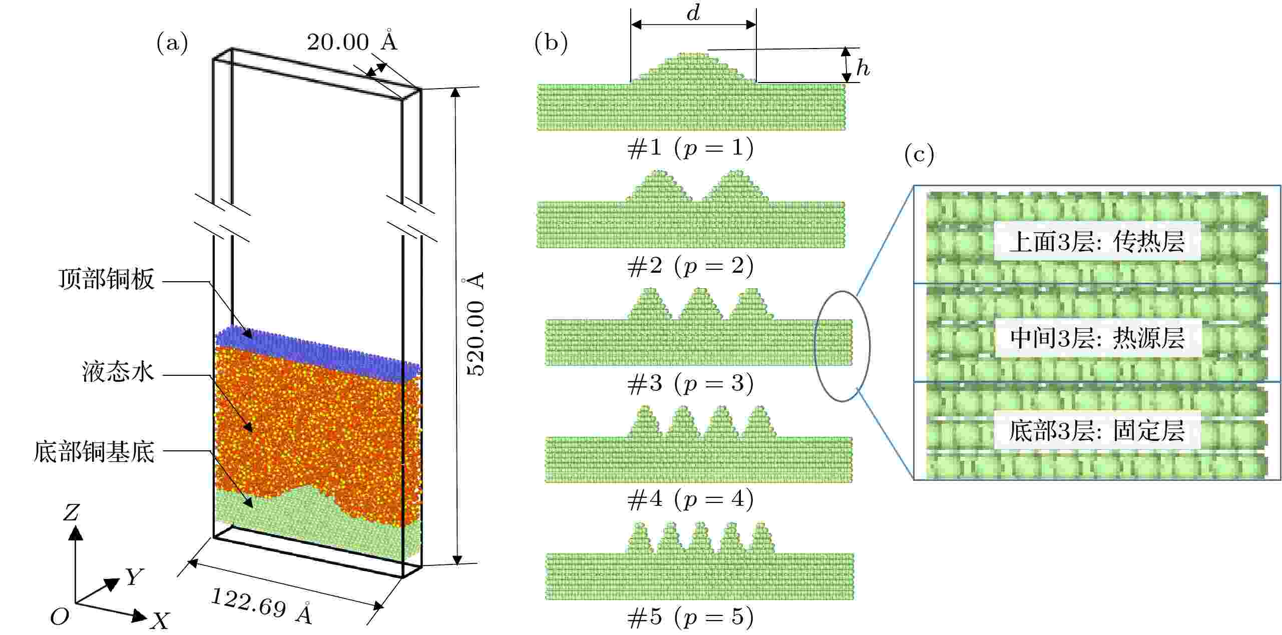 气泡成核在沸腾换热、微流控制设备中的气液分离以及生物医学中的气体传输等相变和流动过程中扮演关键角色, 易受表面润湿性能和粗糙结构的影响. 鉴于实验研究的局限, 本文采用分子动力学方法系统研究了具有不同润湿性能和不同数量纳米凸起的恒热流过热表面对水中气泡成核的影响规律和微观机制. 结果表明, 在相同表面润湿性能下, 随纳米凸起数量增加, 表面粗糙度增加, 气泡成核时间点提前; 对具有相同粗糙度的表面, 随表面亲水性增强, 气泡成核时间点提前; 在本文研究范围内, 具有最大粗糙度的亲水表面上水的气泡成核最早. 近壁面处水的密度和温度随时间的变化以及密度和温度的空间分布的分析表明: 由于热量积聚, 纳米凸起与底部平面连接拐角处最易成为气化核心. Kapitza热阻的计算结果表明: 亲水性越强的表面具有越低的固-液界面热阻, 越有利于气泡成核. 本文为理解气泡成核的微观机制及优化传热、传质和流体控制系统的设计提供了理论依据.