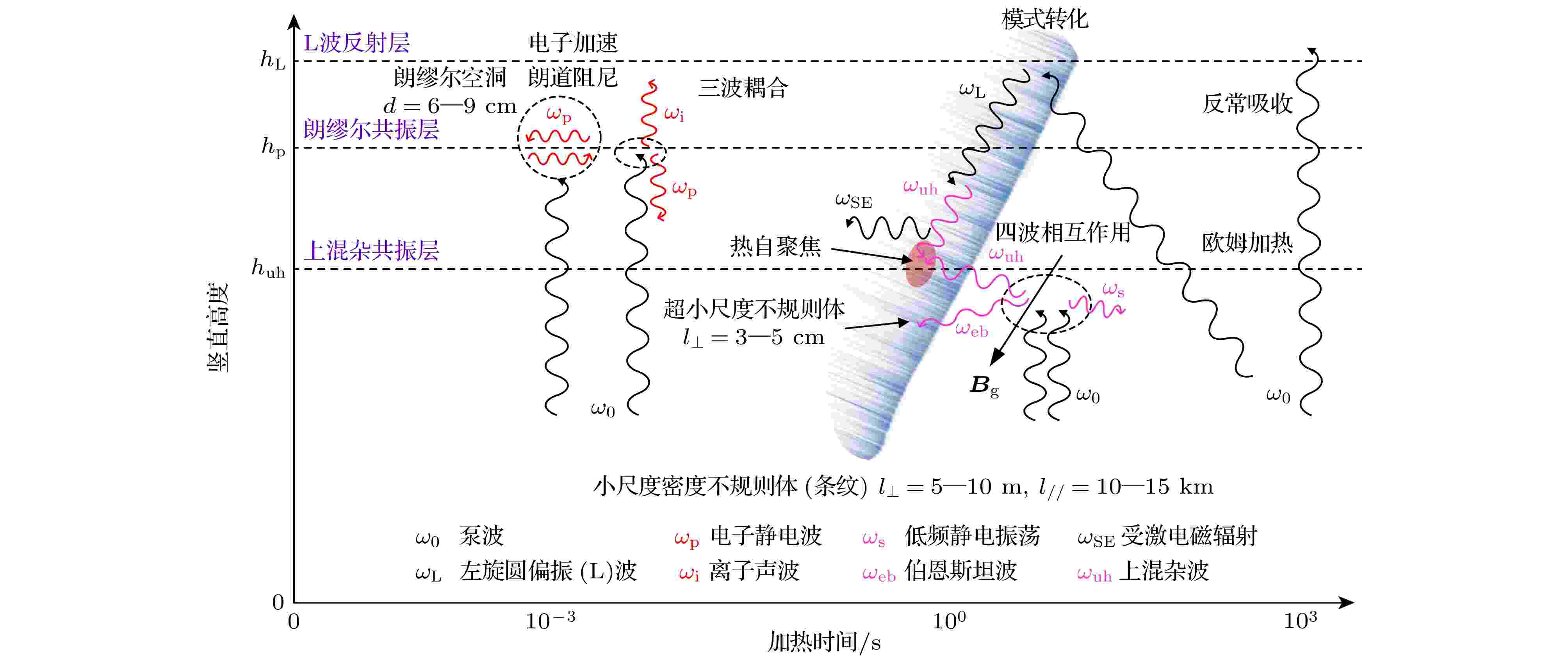 以地面发射的高功率电磁波与电离层等离子体之间的相互作用为研究对象, 基于等离子体流体模型和Zakharov方法, 建立了用于描述地面泵波作用下电离层等离子体中波-波、波-粒相互作用的物理数学模型, 开展了电离层主动加热的数值模拟研究. 计算结果表明: 当地面发射的泵波在电离层等离子体中传播时, 反射高度处电磁波能量的沉积会产生较强的局部电场, 从而激发参量不稳定性过程; 当满足频率和波矢的匹配关系时, 会激发泵波、Langmuir波和离子声波三波相互作用的参量衰减不稳定性, 以及泵波、上混杂波和下混杂波三波相互作用的参量不稳定性; 在本文所研究的泵波频率和功率范围内, 泵波频率的降低会导致寻常波的反射高度降低, 且电子温度的扰动比例随着频率的降低而升高, 而泵波功率的增大则会导致等离子体从泵波中吸收的能量增大、电子温度升高. 本文数值模拟结果揭示了不同泵波参数对电离层等离子体特性时空演化的影响规律以及波-粒能量输运过程, 阐释了实验观察到的参量不稳定性和受激电磁辐射等的产生机制.