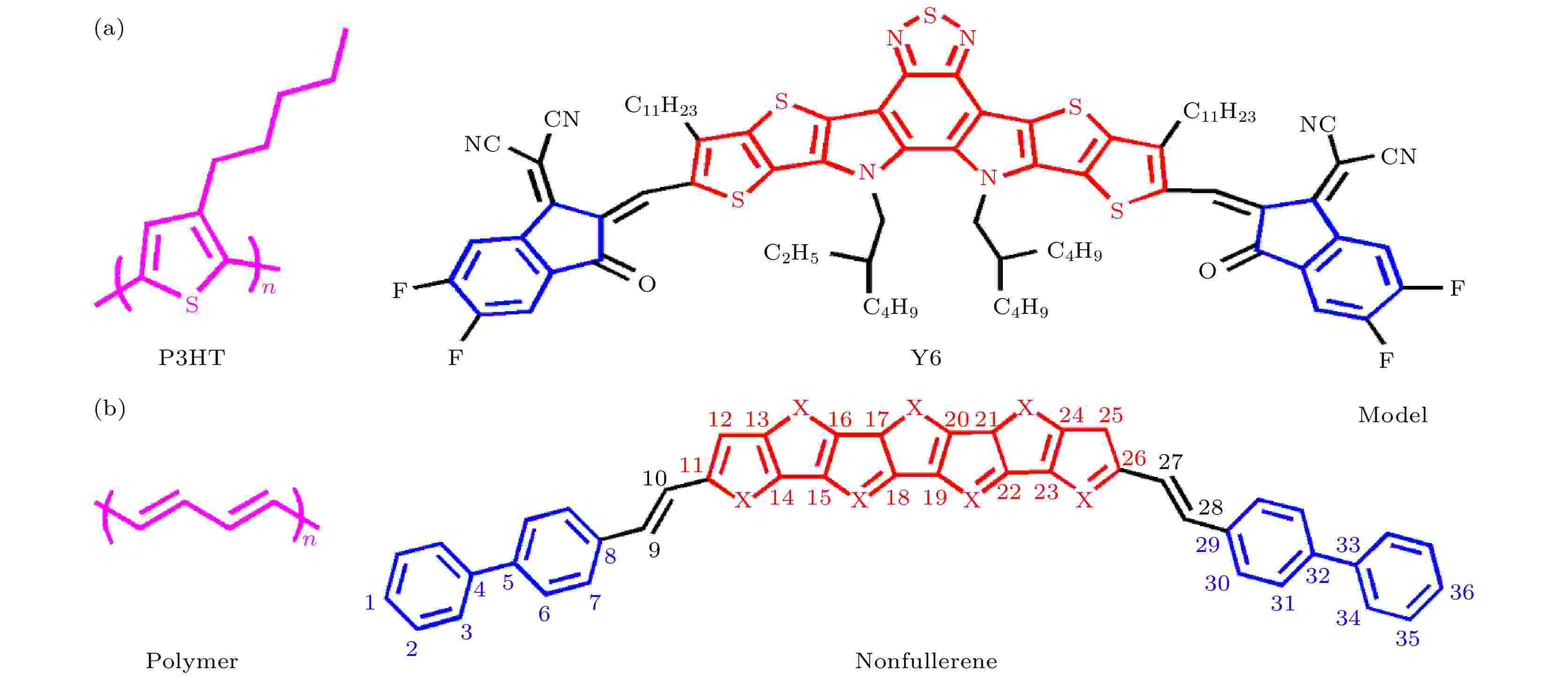 有机半导体材料的高激子束缚能限制了电荷分离效率, 研究聚合物给体和非富勒烯受体分子激发态特性对优化材料设计和提升有机光伏器件性能至关重要. 本文通过紧束缚量子模型, 对比两类材料的激发态性质, 发现非富勒烯比聚合物的晶格畸变更小, 带隙更窄, 束缚能更低, 并可以通过降低电子-晶格耦合强度来进一步减小聚合物和非富勒烯分子晶格畸变、带隙及束缚能. 除此之外, 还发现通过增强非富勒烯分子中间基团的给电子能力或端基吸电子能力, 可以优化能级结构, 进一步降低束缚能, 实现有效的电荷分离. 结果表明, 聚合物/非富勒烯有机光伏体系有效的电荷转移与分离源于其分子激发态特性的差异, 通过协同调控电子-晶格耦合作用和非富勒烯分子推拉式电子结构, 可设计高性能的有机光电材料并开发新型非富勒烯有机光伏器件.