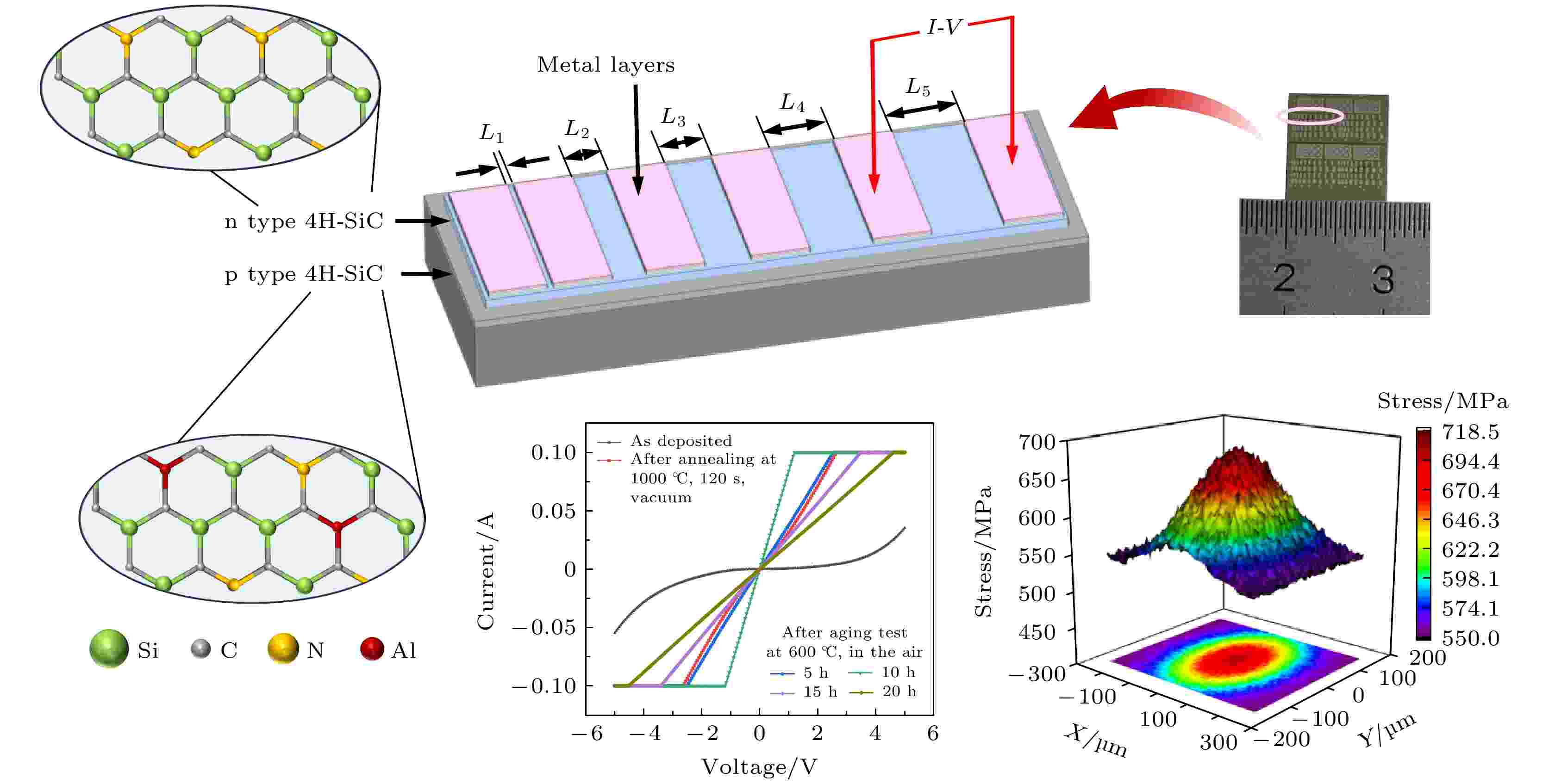 高温高压下硅基设备因自热效应漏电及形变, 无法长期稳定工作. 碳化硅作为第三代半导体在高温高频场景优势显著, 但其4H-SiC器件极限高温性能瓶颈源于欧姆电极与金属互连稳定性, 当前引线电极存在输出不稳定问题, 高温下氧气侵入易致输出失效. 研究在SiC/Ti/TaSi2/Pt欧姆接触基础上, 提出分批次溅射退火工艺制备耐高温引线电极, 通过改变退火与溅射顺序, 先在SiC衬底溅射Ti/TaSi2并退火形成欧姆接触, 再沉积Pt保护层, 构建新型SiC/Ti/TaSi2/Pt电极结构. 分批次溅射后退火形成的电极结构更致密, 600 ℃高温老化实验表明, Ti/TaSi2形成欧姆接触后溅射Pt的电极电学性能更稳定, 即初始比接触电阻率为6.35×10–5 Ω⋅cm2, 20 h空气老化后仍保持欧姆特性; Pt可有效抑制原子扩散和氧化反应使其电极微观形貌平整无卷曲. 分批次溅射退火工艺能显著提升SiC欧姆接触综合性能, 对其他金属组合欧姆接触的结构优化、稳定性提升及应用拓展具有重要指导意义, 为开发热稳定性强、适应复杂环境的欧姆接触提供思路.