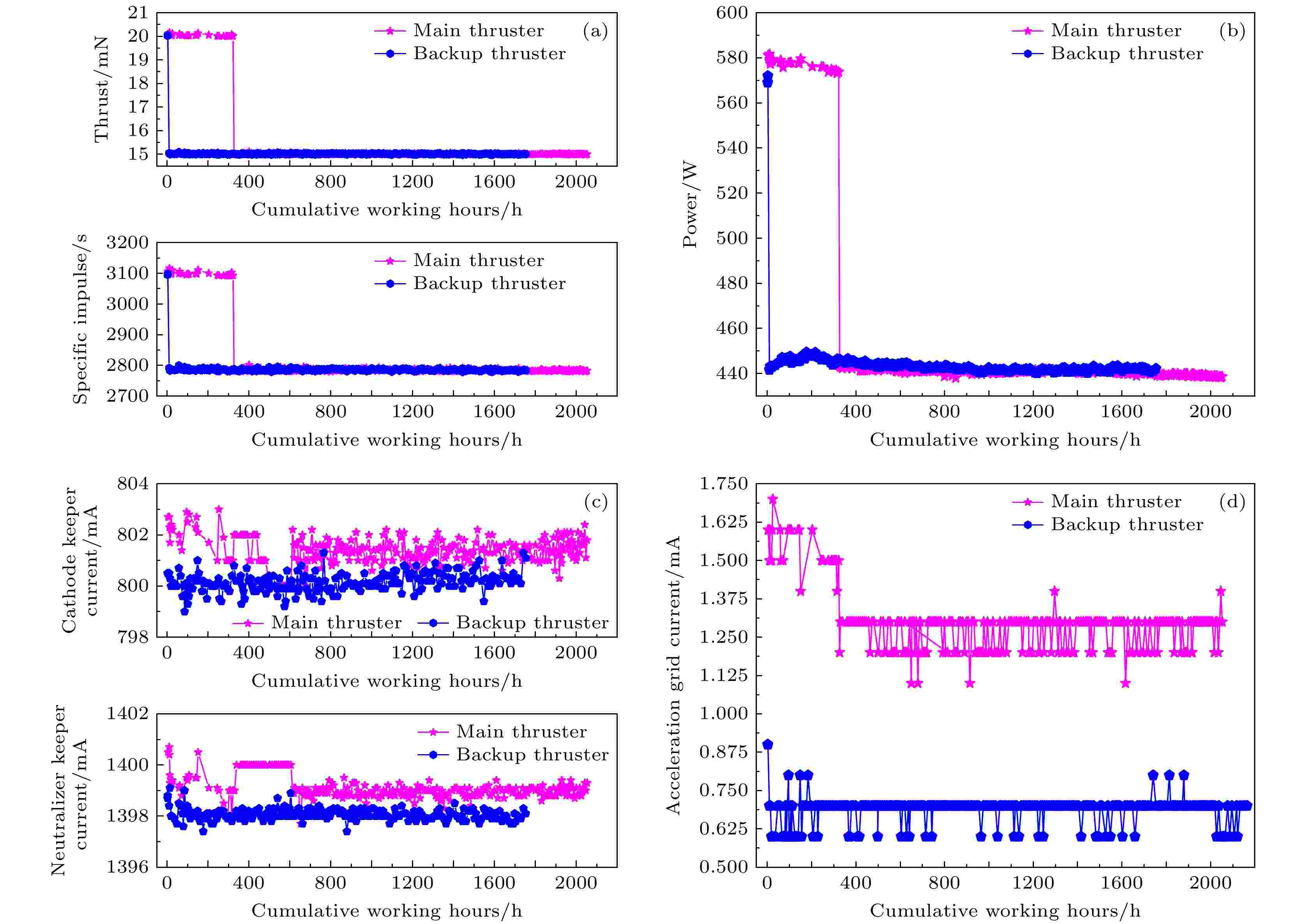 为满足重力梯度测量卫星无拖曳飞行任务和近地轨道高分辨率观测卫星精确维轨任务对离子推力器连续变推力能力及其高分辨率特性的应用需求, 对高分辨率宽范围变推力离子推力器开展了技术研究与应用验证. 基于Kaufman型离子推力器等离子体放电与离子束流引出两大关键物理过程之间的弱耦合性和相对分离性, 提出了发散场构型的宽范围变推力离子推力器技术方案, 开展了放电室宽范围放电稳定性设计、兼顾宽温域启动和高密度引出需求的凹球面离子光学系统构型设计以及空心阴极电流发射连续性设计等技术研究工作. 基于此, 完成了10 cm口径高分辨率宽范围连续变推力离子推力器的设计优化与地面性能评测, 并在2023年实现在轨飞行应用. 卫星在轨测试结果表明: 10 cm口径高分辨率宽范围连续变推力离子推力器可在98.3—585.3 W功率范围内实现1.39—20.05 mN的推力调节, 比冲保持在547—3056 s范围内, 与地面测试结果相当; 推力响应速率约为3 mN/s, 推力分辨率不低于15 μN, 较地面测试结果更佳. 相比同类型传统化学推进模式下的卫星轨道控制效果, 基于10 cm口径高分辨率宽范围连续变推力离子推力器的卫星维轨精度提高2个数量级, 有效保障了卫星在轨工程任务的实施.