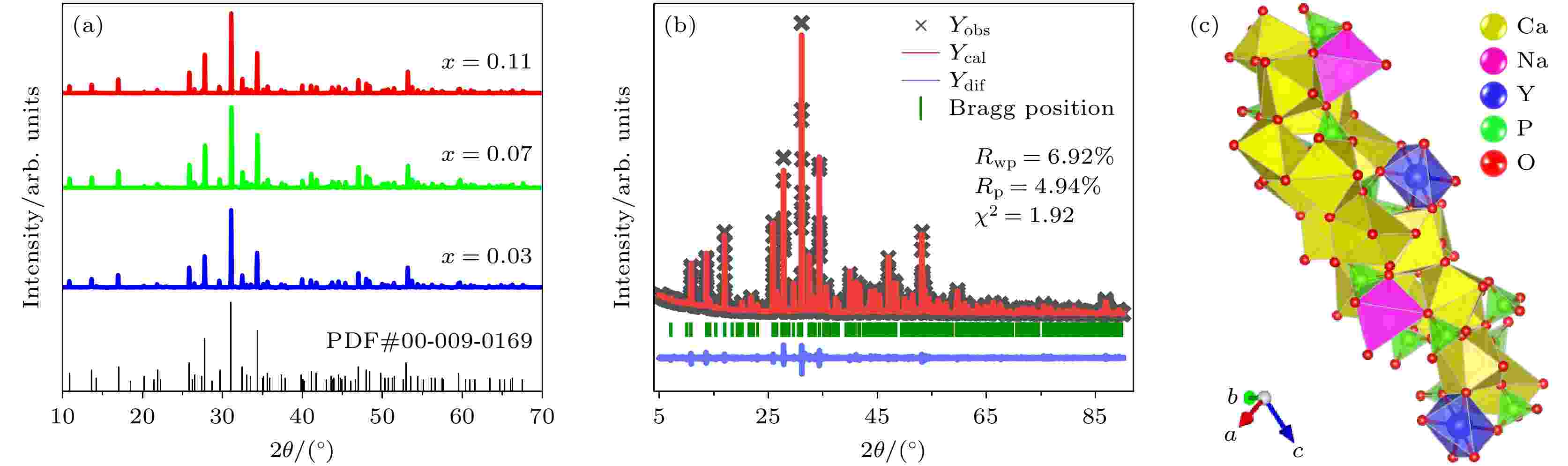 稀土离子掺杂荧光粉在照明、显示、防伪和光学测温等领域具有广阔的应用前景. 本文采用高温固相法制备了Ca7NaY(PO4)6: xDy3+ (x = 0.01—0.11)系列荧光粉. 通过X射线衍射和扫描电子显微镜对样品的晶体结构和微观形貌进行了表征, 并采用荧光光谱和荧光寿命衰减曲线对其发光特性和能量传递机制进行了系统研究. 在350 nm近紫外光激发下, 样品的发光强度随Dy3+掺杂浓度增加呈现先递增后递减的变化趋势, 在x = 0.07时达到最大值. Dy3+浓度增加导致非辐射跃迁增强, 荧光寿命逐渐降低. Ca7NaY(PO4)6: 0.07Dy3+在150 ℃高温下发光强度仍为室温时的87.6%, 展现出优异的热稳定性. 利用最佳样品与近紫外LED芯片封装所得白光LED器件性能优良, 其相关色温为5680 K, 色坐标位于(0.3275, 0.3883). 此外, 基于荧光强度比技术的温度传感特性研究表明, 该材料具备良好的光学测温潜力, 最大相对灵敏度达到1.72%/K. 结果表明, Ca7NaY(PO4)6: Dy3+荧光粉在固态照明及光学温度传感领域具有潜在的应用价值.