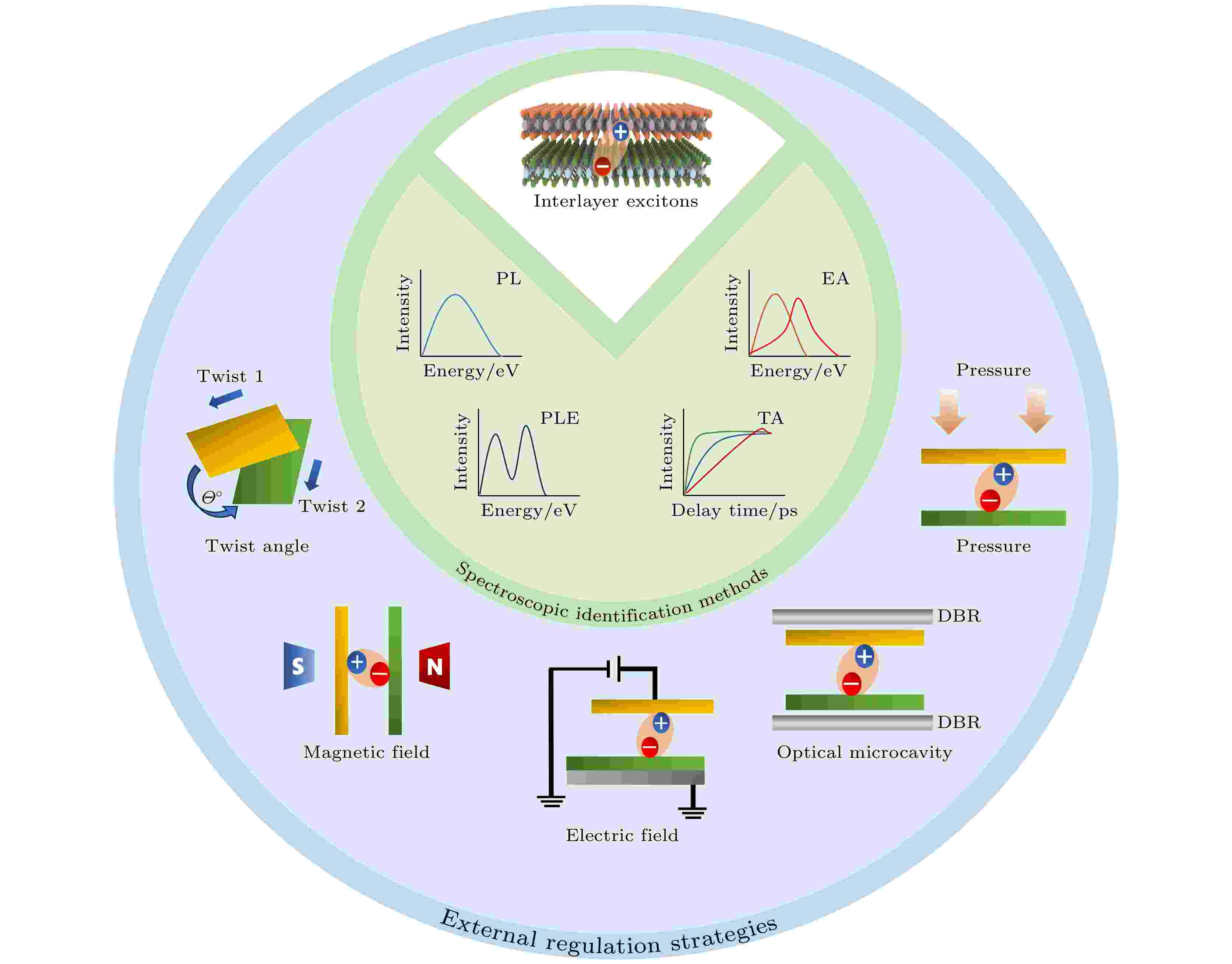 层间激子是由范德瓦耳斯异质结构中相邻材料层内的电子与空穴通过库仑作用束缚形成的激子, 通常表现出空间间接性, 因而具有较大结合能、长寿命及主要沿垂直方向分布的电偶极矩, 在低维激子物理与新型光电器件研究中具有重要意义. 过渡金属二硫族化合物异质结构因其天然的能带对齐特性成为理想研究平台. 本文综述了层间激子的形成机制与判定方法, 总结了在典型能带结构下激子的能量分布、空间归属与态属性, 并归纳了光致发光光谱分析、瞬态吸收和电调制吸收等表征手段的识别特征. 在此基础上, 系统梳理了电场、磁场、光场、应力、扭转角等外部条件对激子能级、复合行为与光谱特征的调控规律, 并介绍了温度变化、多激子作用和多层堆叠结构等辅助策略, 揭示了层间激子的行为受能带结构、界面耦合影响及局域势场共同作用的复杂性, 对构建可控激子态与激子功能器件具有重要意义, 有望推动其在低功耗逻辑、量子光源与集成光电子芯片等领域的实际应用.