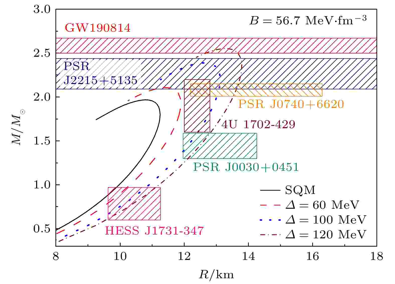 基于MIT袋模型计算了零温与强磁场下奇异夸克物质与色味锁夸克物质的热力学性质. 发现色味锁态下夸克物质的热力学性质受色味锁夸克物质的能隙常数、磁场强度影响很大, 特别是物态方程会随着能隙常数的增加而变硬, 压强随着磁场强度的增加而呈现明显的各向异性. 结果表明色味锁态下基于MIT袋模型的夸克星质量半径曲线可以通过多个目前实验估测的脉冲星质量-半径区域, 色味锁夸克星的最大质量会随着能隙常数的增加而增大. 强磁场下色味锁磁星的质量与磁星内部磁场强度与方向的分布关系紧密, 星体物质的多方指数会随着星体质量的增加而减小.