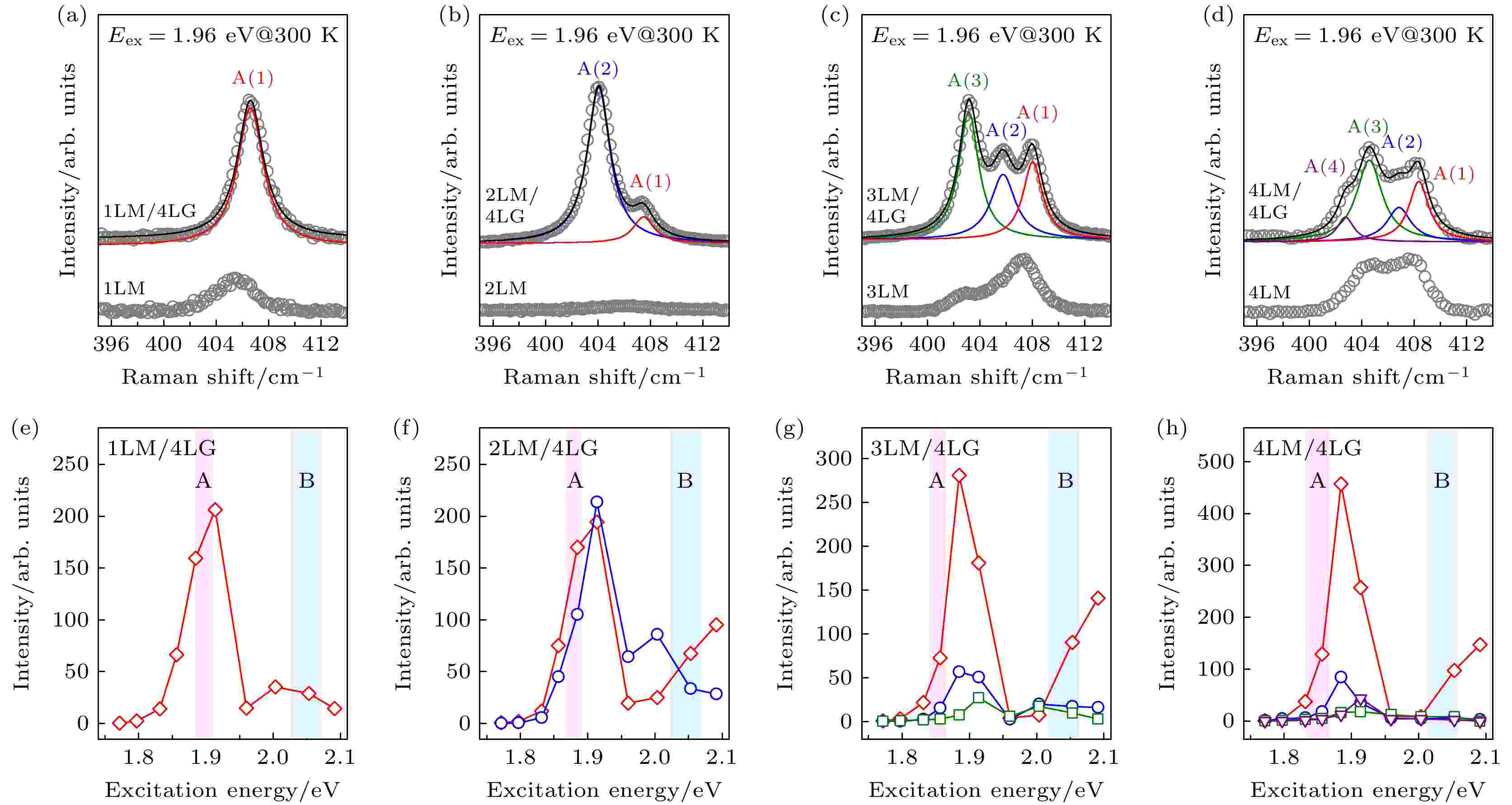 二维过渡金属硫族化合物(TMDs)中层内振动模的Davydov组分与其层间耦合密切相关. 尽管带边共振拉曼光谱能极大地增强TMDs拉曼峰的强度, 但Davydov组分的拉曼峰极易被带边光致发光信号所压制, 因此所有组分的拉曼峰在室温下难以同时被实验观测. 本文通过构建少层TMDs与石墨烯薄片的范德瓦耳斯异质结, 利用超低波数拉曼光谱证实了其良好的界面耦合质量并精准测定了其中TMDs和石墨烯薄片成分的层数. 利用带边共振拉曼光谱技术, 同时观测到了异质结中MoS2, MoSe2和WS2成分A模各Davydov组分的拉曼峰. 研究表明, 上述现象起源于三种机制的共同作用: 1)二维过渡金属硫族化合物成分的对称性降低, 可以激活A模Davydov劈裂红外禁戒模; 2)界面电荷转移可有效抑制荧光背景; 3)异质结中光激发载流子的非辐射弛豫有效抑制了TMDs成分的能带填充效应. 进一步研究发现, 界面耦合对异质结中TMDs成分层内振动模的微扰导致其A模频率整体蓝移. 本研究为二维材料范德瓦耳斯异质结的界面耦合与声子调控提供了研究范例, 并揭示了异质结成分层数、对称性破缺及界面耦合对异质结成分声子行为的协同调控机制.