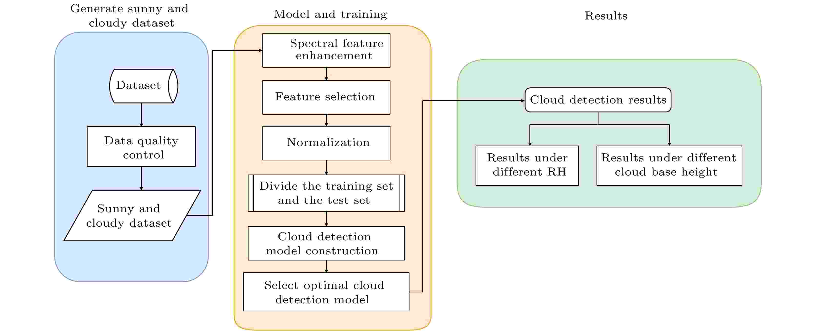 云是地基红外高光谱仪器探测大气的重要干扰源, 有效云检测不可或缺. 水汽干扰和高云识别精度低是云检测面临的两个关键挑战. 本文利用大气红外光谱探测仪(ASSIST)在云南丽江、西藏自治区墨脱和西藏自治区日土的观测数据, 分析了晴空和有云条件下的光谱特征差异, 并据此提出了一种光谱特征增强的机器学习云检测方法. 结合同步观测的激光雷达、气象站及全天空成像仪数据, 系统评估了该方法在不同相对湿度(RH)和不同云底高度(CBH)条件下的检测性能. 实验结果表明: 该方法与激光雷达检测结果的一致性高达97.61%. 在不同RH条件下, 该方法精度均优于使用原始光谱特征的方法, 尤其在RH > 70%时, 对晴空光谱的识别精度提升明显, 从86.01%提高至91.89%. 同样, 在不同CBH条件下, 新方法也展现出优于使用原始光谱特征方法的性能, 特别在识别3 km < CBH 5 km的中云和CBH > 5 km的高云时, 精度提升尤为明显. 当3 km < CBH 5 km时, 精度从95.45%提升至98.64%; 当CBH > 5 km时, 精度从87.5%提升至91.67%.